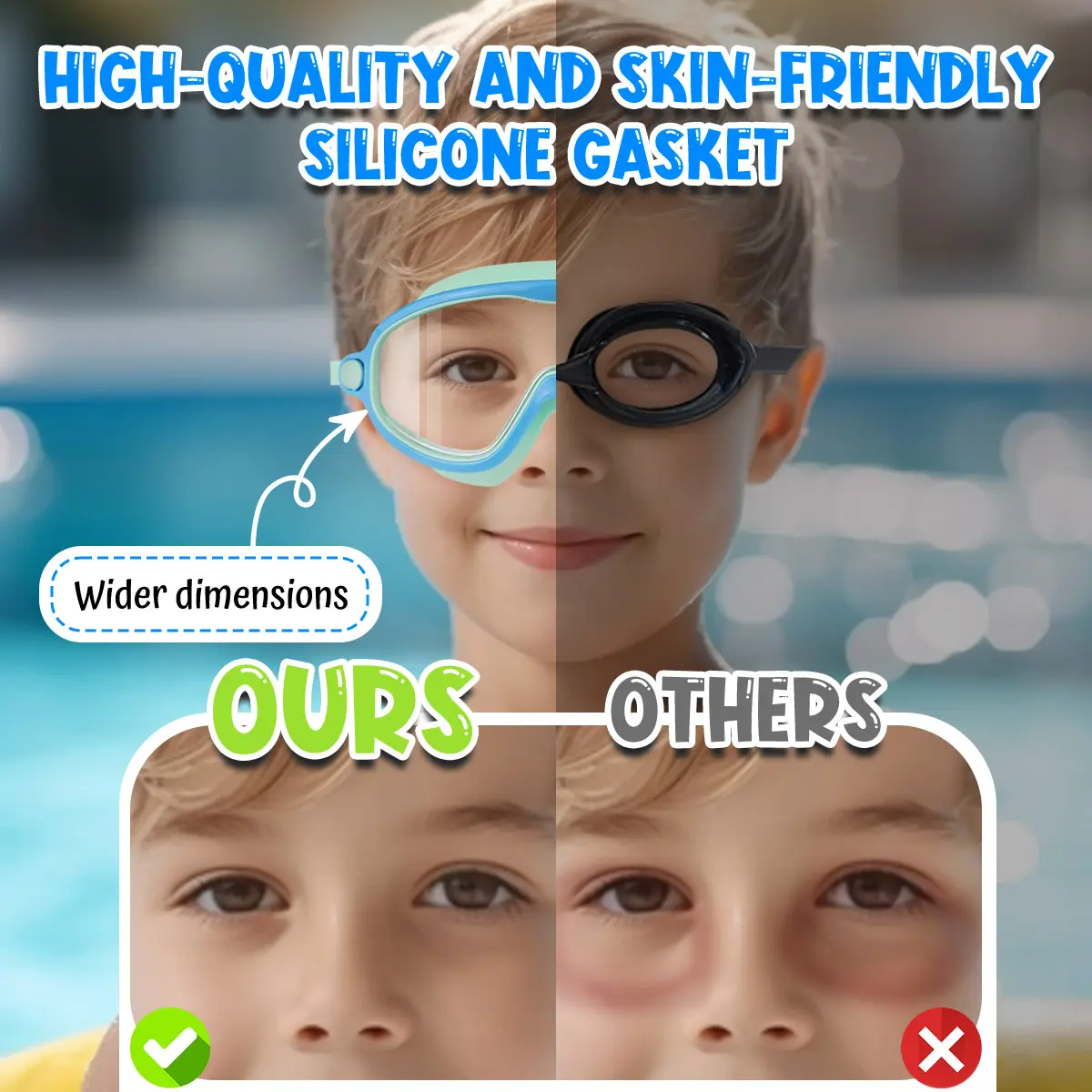 Our swim goggles feature soft silicone cushioned frames for a snug fit, ensuring comfort and a waterproof seal to protect kids' eyes. No more raccoon eyes—just worry-free swimming fun!