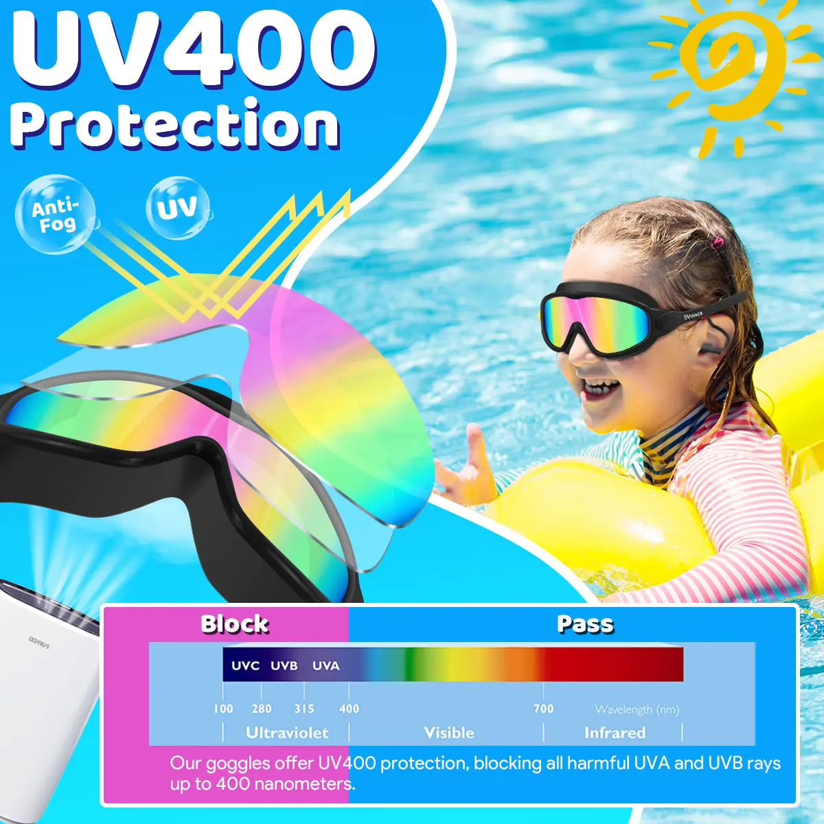• 【Upgraded Anti-Fog & UV400 Protection】Our kids swimming goggles feature advanced anti-fog technology and UV protection for clear, safe swimming. The one-piece lenses provide an expanded, 180 degree unobstructed view, while the mirrored lenses block harmful UV rays and reduce sun glare. Perfect for pool parties, swim lessons, or outdoor water fun, these goggles for kids aged 8-14 deliver crystal-clear vision and superior eye protection.
