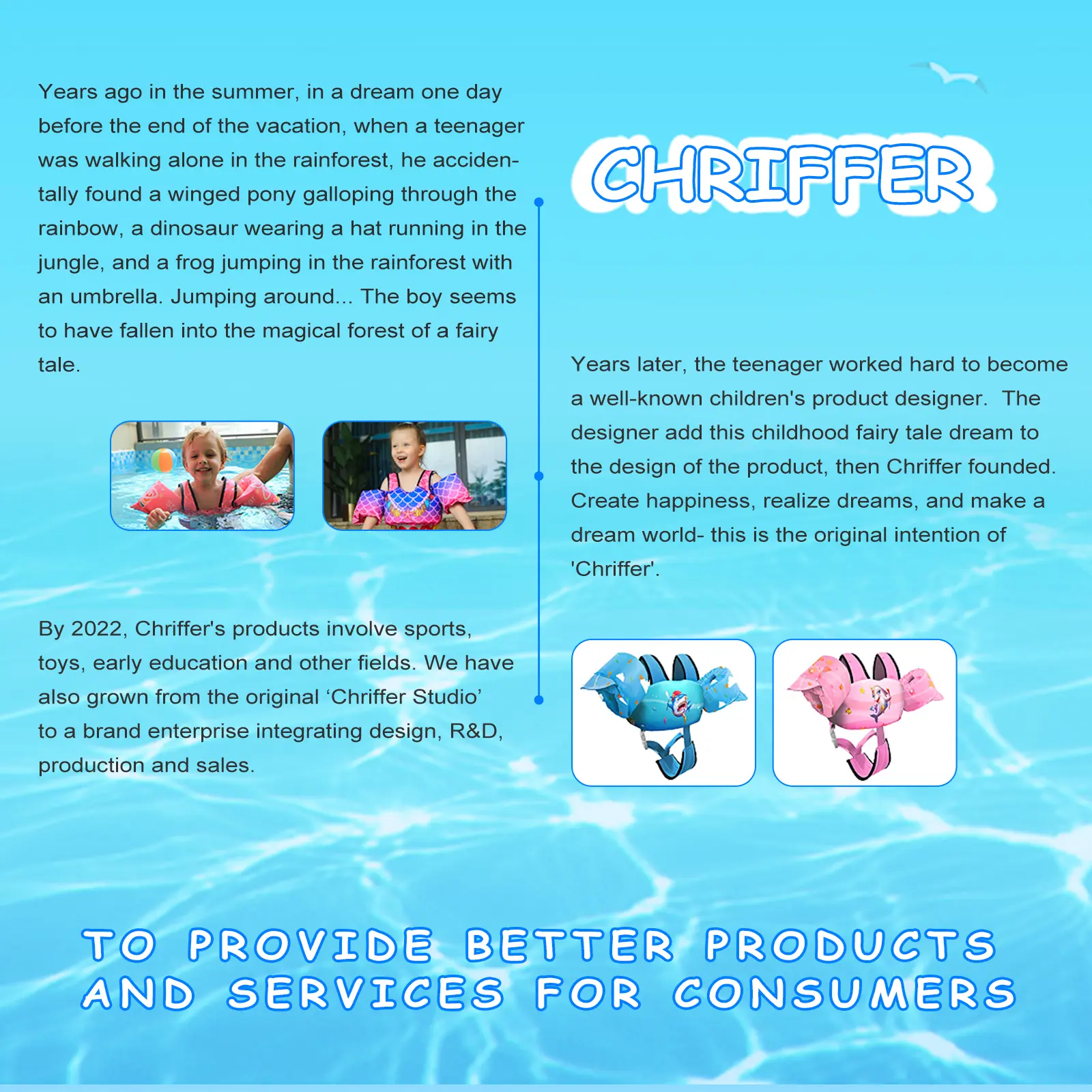 Chriffer - starts from 'Chriffer Studio' - The designer adds his childhood fairy tale dream to the design of the product to bring children into the happy realm of pure fantasy. Chriffer links children's childhood and happiness with rich colors and cute patterns by unique design ability that cannot be imitated by others.