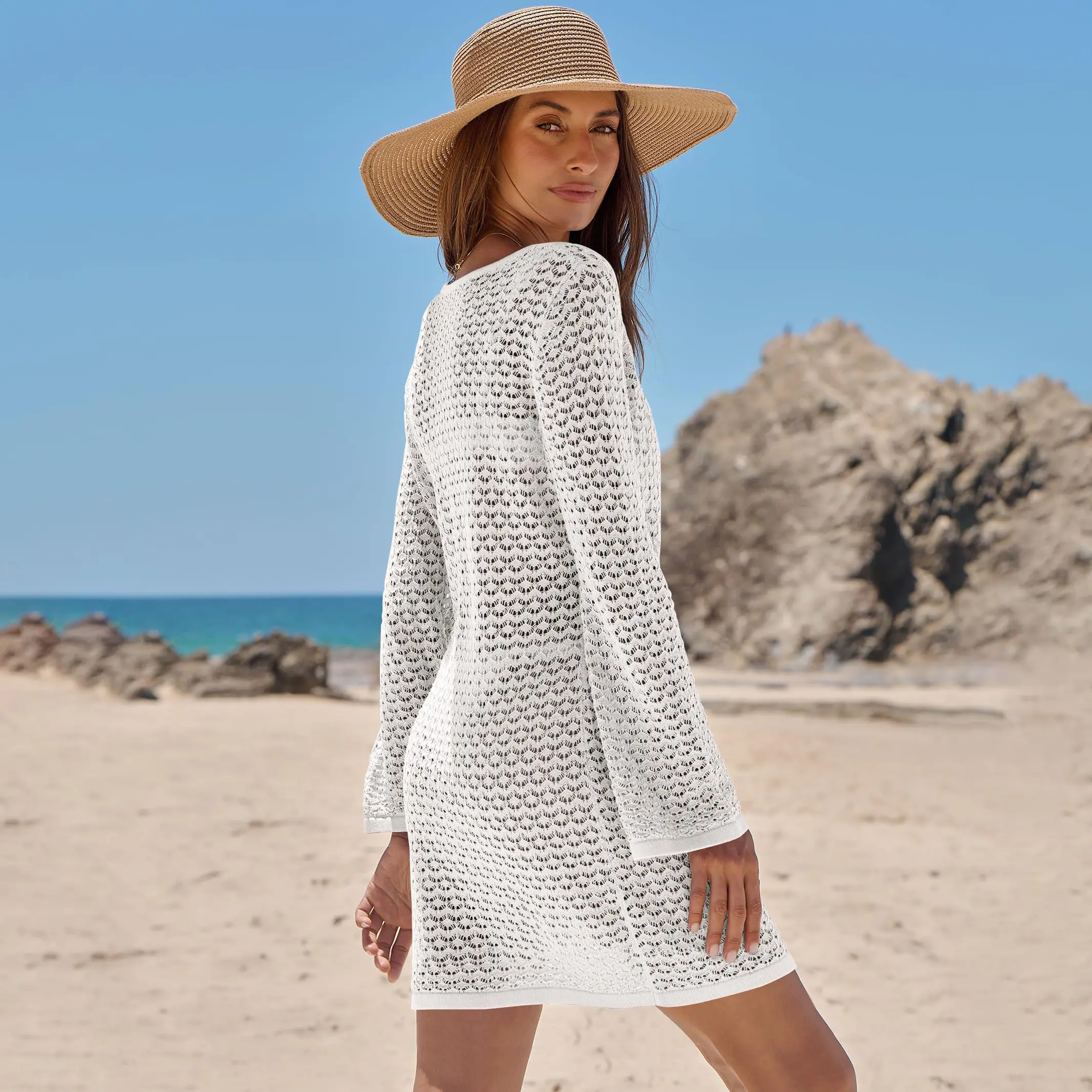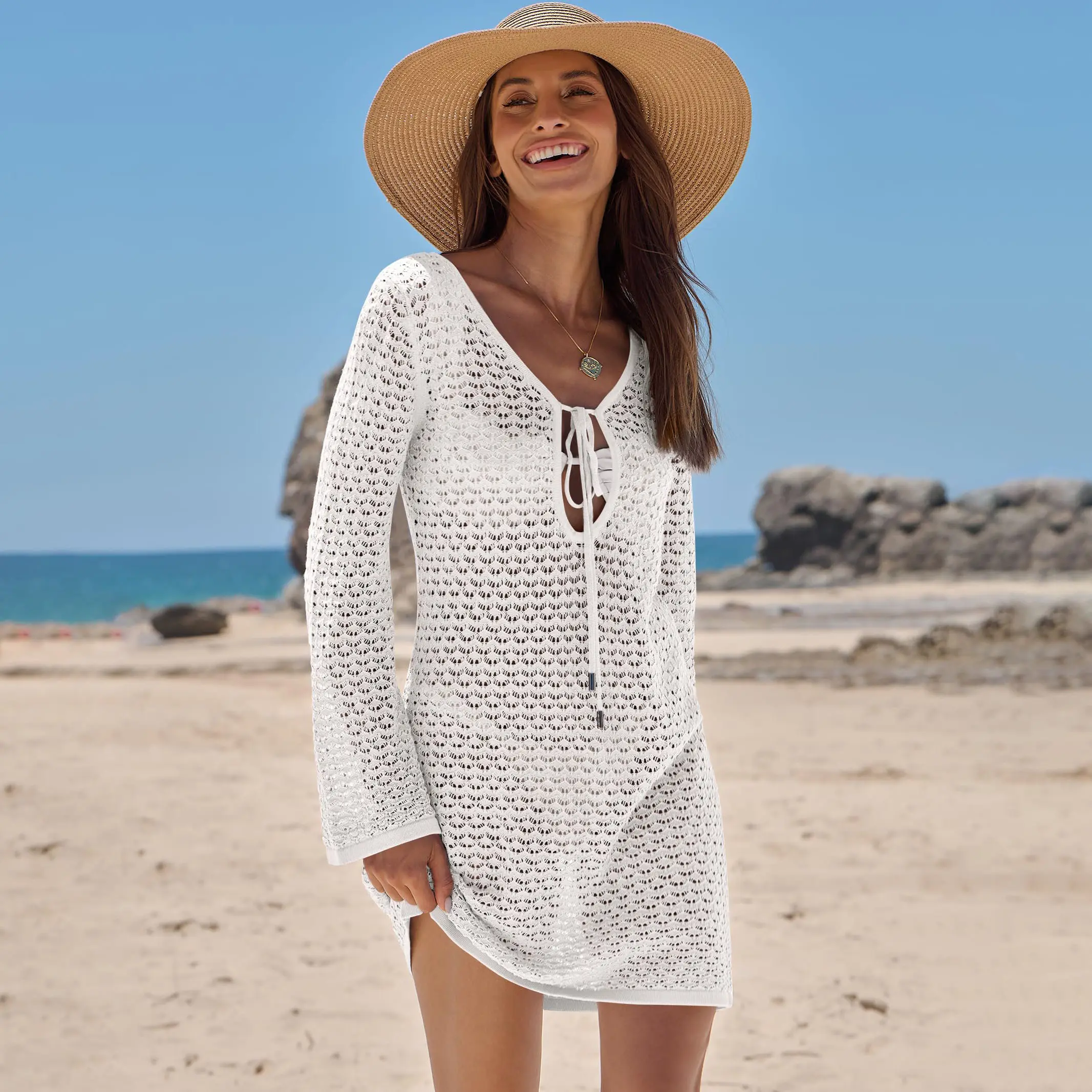 ·Features - Women's summer crochet swim cover ups,long sleeves,tie front,hollow out,knitted.This women's swimsuit perfect for beach,vacation,daily wear.