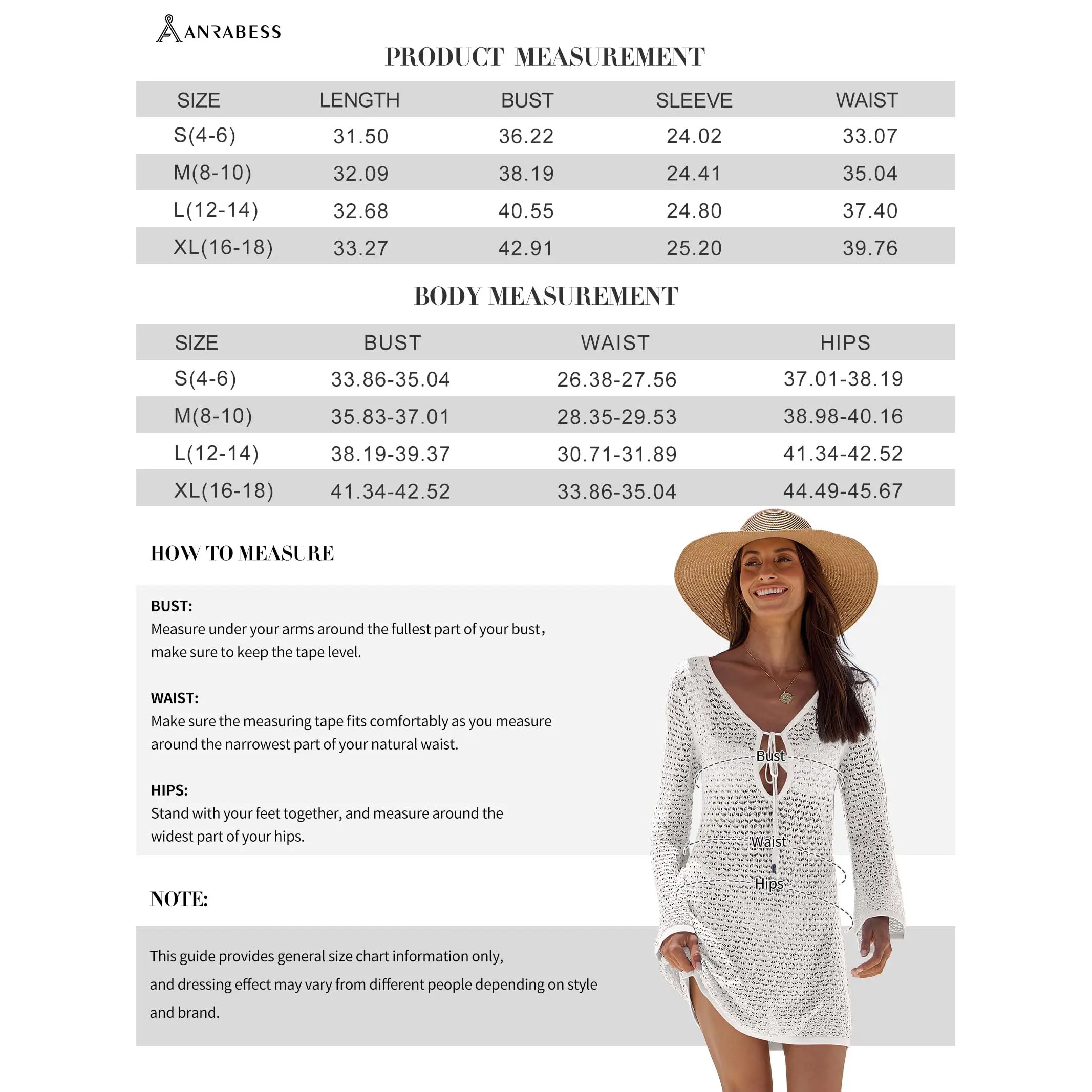 Size Chart Of ANRABESS Swimsuit Cover Up
