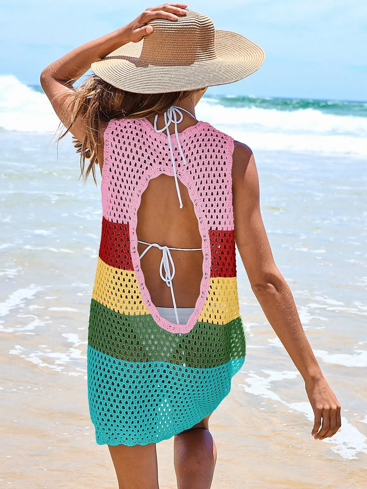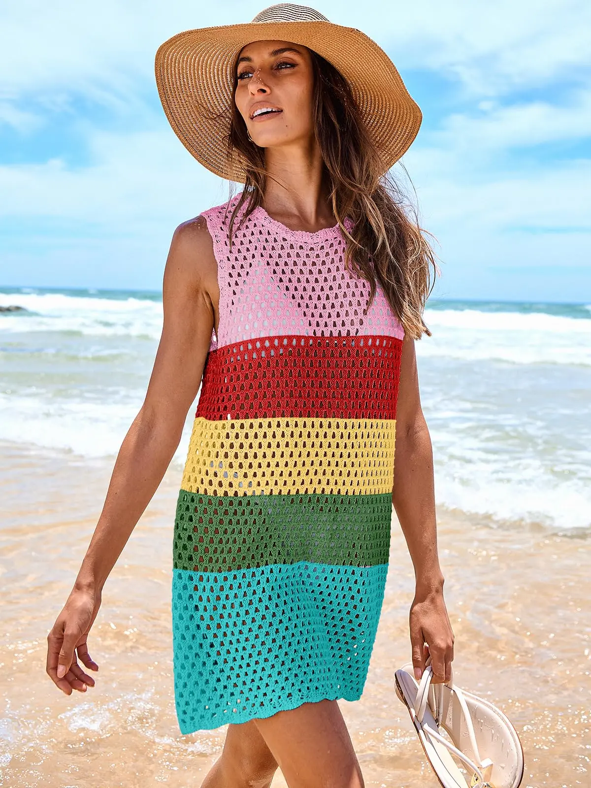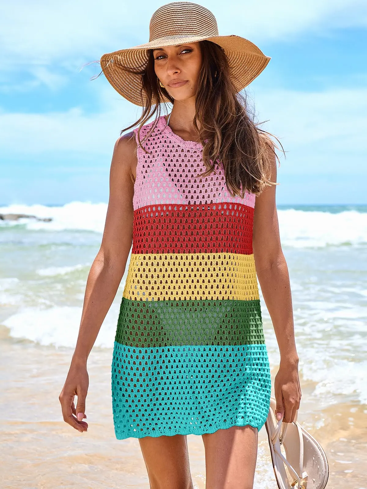 ·Features - Elevate your beach fashion with our gorgeous knit crochet swimsuit mini dress! Its charming round neck and sleeveless design exude elegance, while its plush and top-notch acrylic material offers ultimate comfort. Stylish and comfortable, this dress is a must-have for your summer wardrobe!