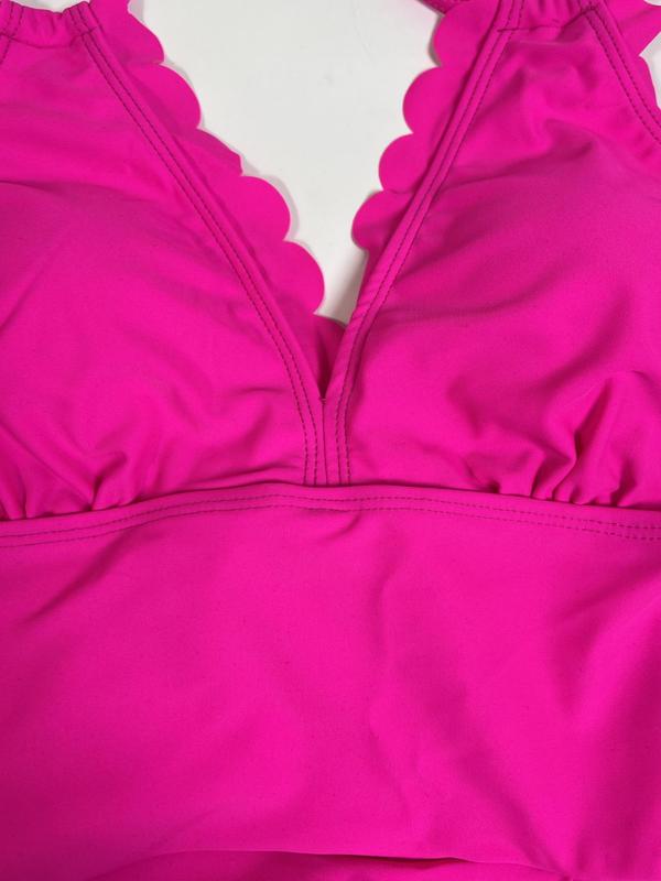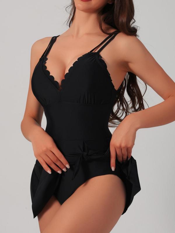 Women's Solid Color Scallop Trim Deep One-Piece Swimsuit, Casual Comfortable Adjustable Strap Tie Back Backless Sleeveless Swimwear for Beach Holiday Vacation