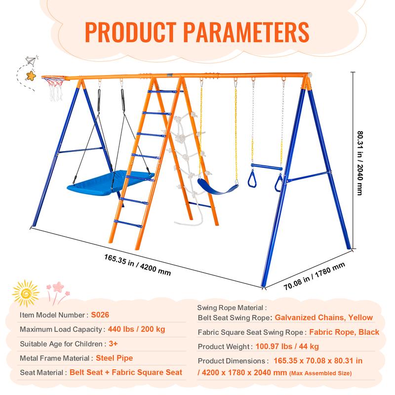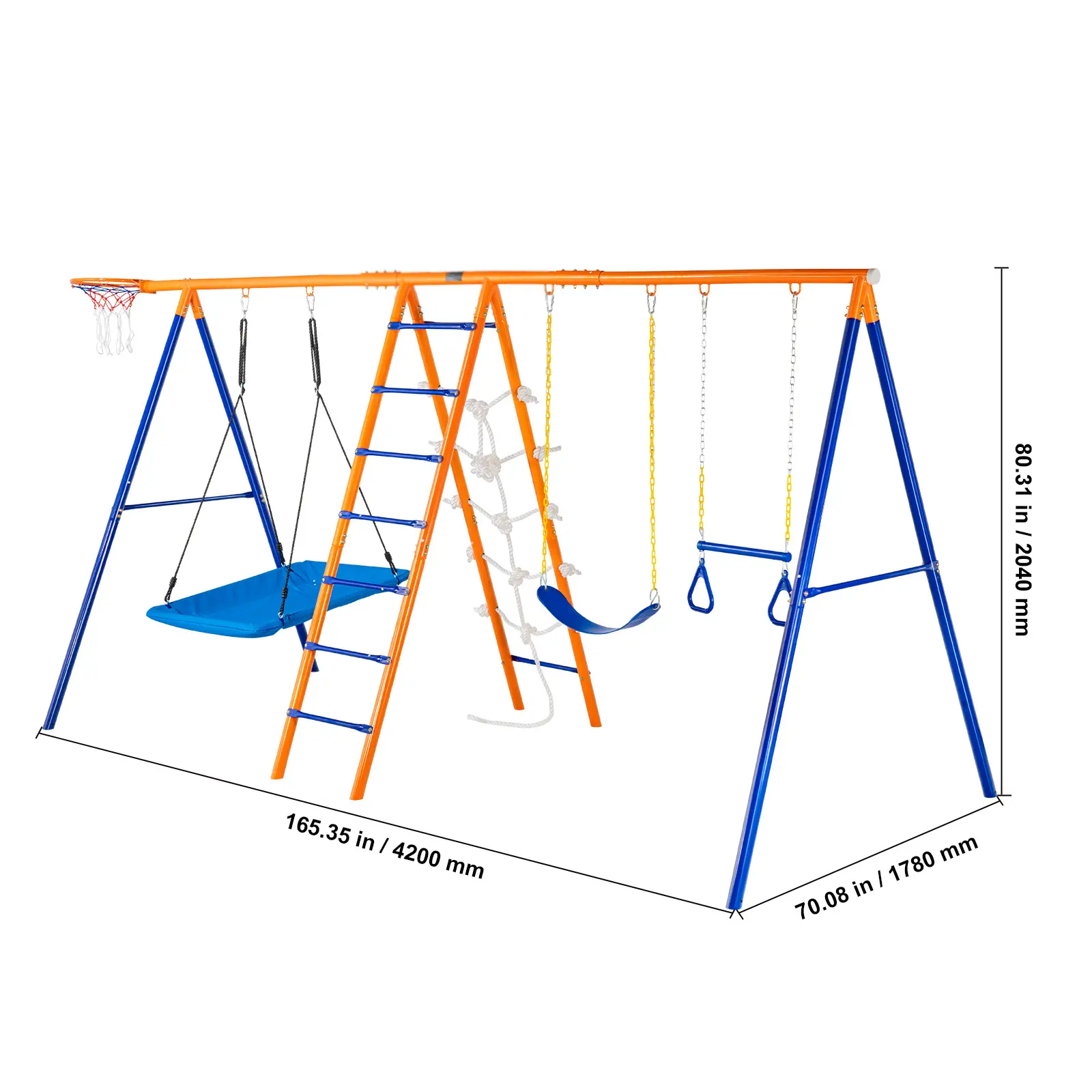 • Six-in-One Design: This A-frame swing set includes two swings, a trapeze, a ladder, a climbing net, and a basketball hoop to meet all fun requirements. Its multiple features allow several children aged 3-12 to play simultaneously.
