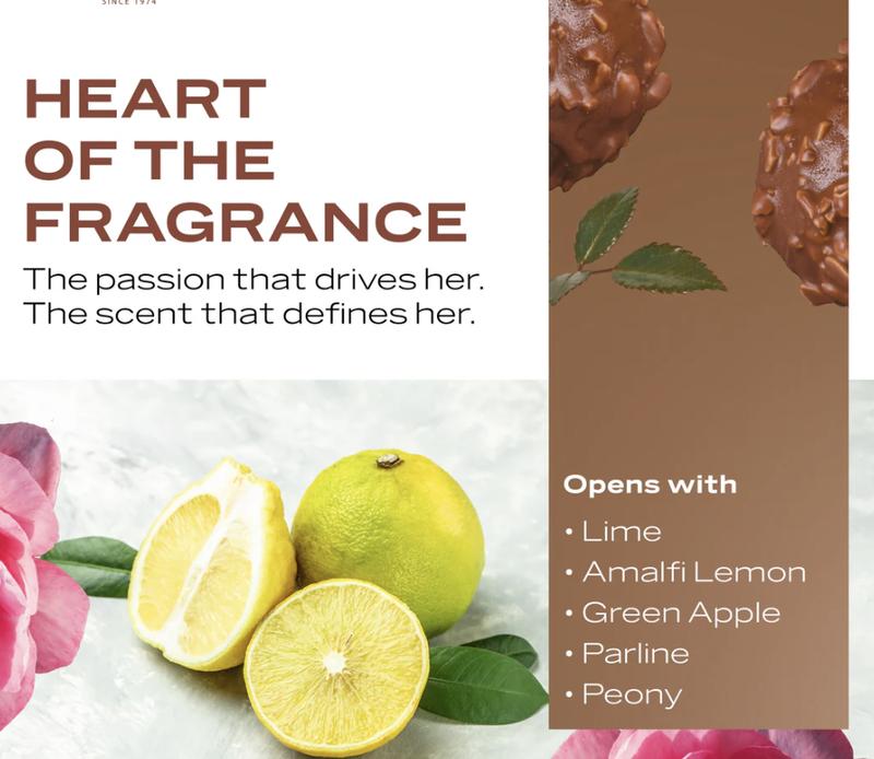 A bold, luxurious scent that commands attention. It opens with sparkling bergamot and juicy fruits, flowing into a heart of tonka, amber, and rose. The base is rich with oud, sandalwood, and golden vanilla — leaving a lavish, unforgettable trail.