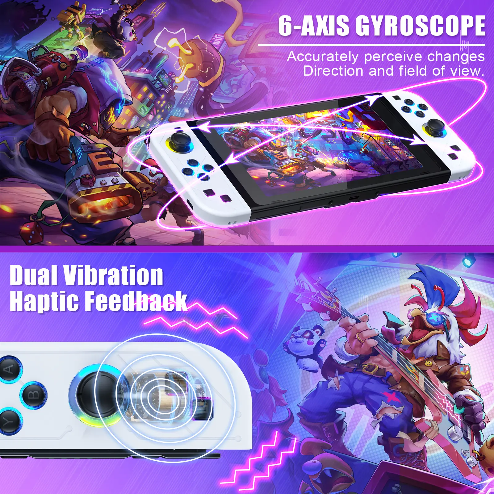 【6-Axis Sensor and Vibration Feedback】-The 6-axis sensor can accurately detect motion information, making the operation of somatosensory games more precise, and the dual vibration motors provide immersive game vibration feedback.