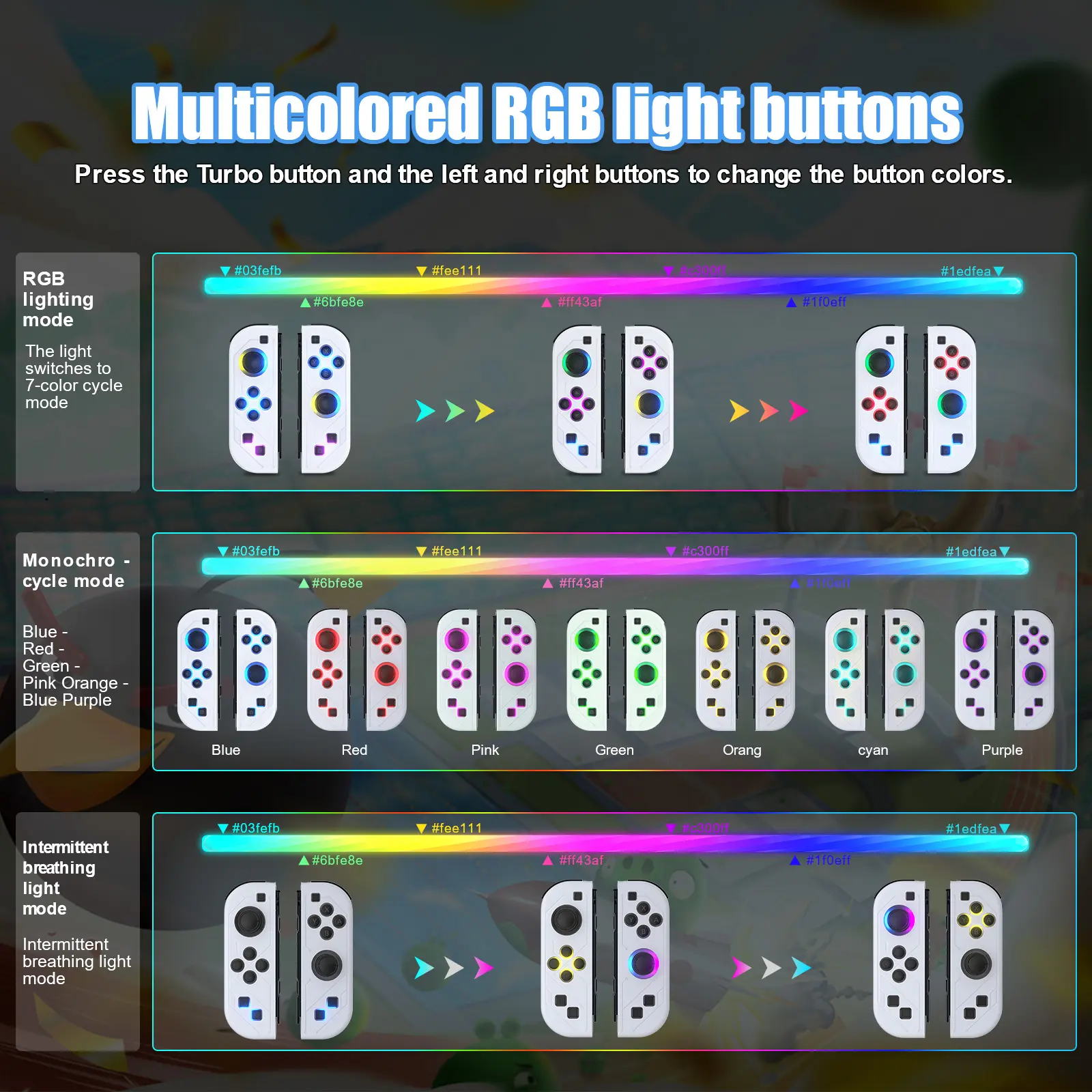 blue-red-green-pink-orange-cyan-violet. When a certain color is reached, press L3/R3 to lock the current color. If you need to switch, press and hold the Turbo button and turn the joystick to left and right to switch to other lighting effects.