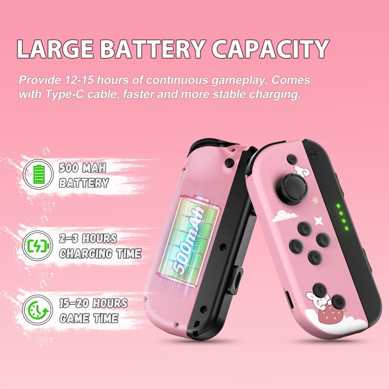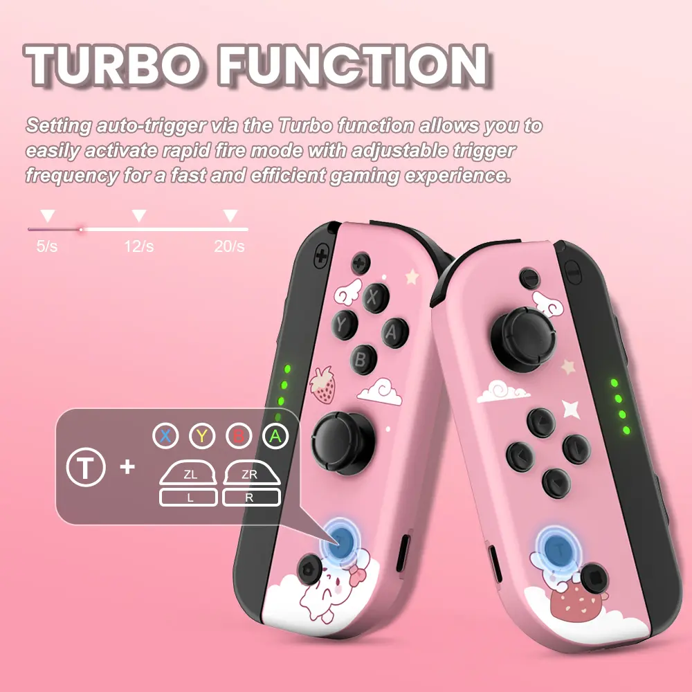 This Switch controller adopts a brand-new appearance beautiful pattern design,Make your Nintendo Switch full of personality. This controller is equipped with a newly enhanced joystick, moderate resistance, is sensitive and does not drift, added Tubro function button, one-click burst. Both the left and right controllers can be used as independent controllers. In addition, the controller is built-in six-axis gyroscope and dual vibration motors, Allows you to make more precise operations in Motion Sensing Game and provides immersive vibration feedback. built-in 650 mAh battery, charging for 2-3 hours can provide 12-15 hours of battery life.