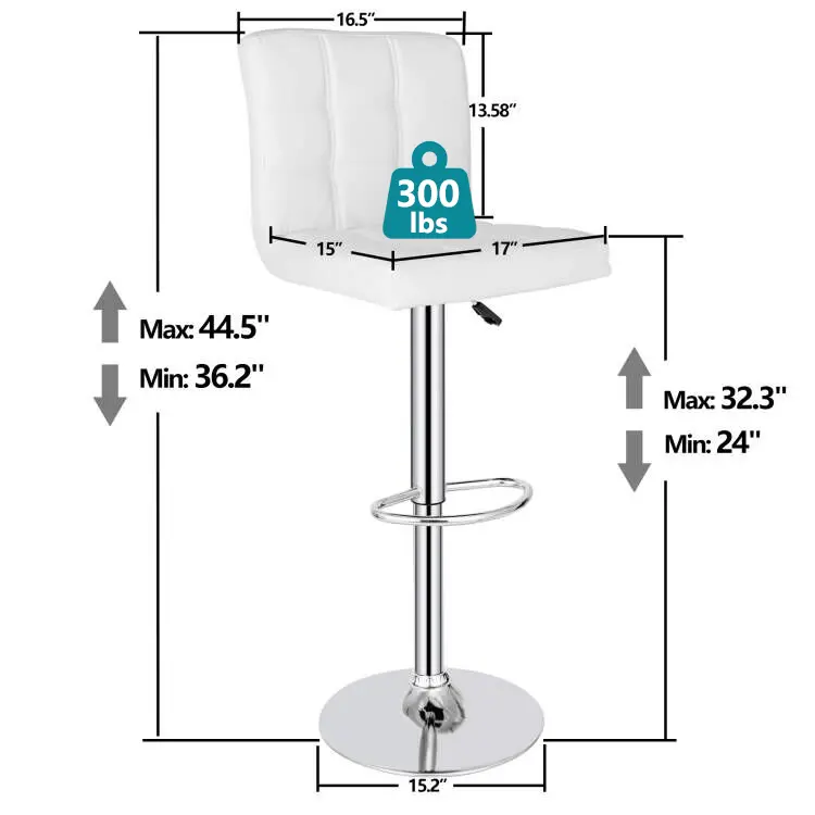 Chrome Base Diameter: 15.2" Adjustable Height: 24"-32"H Seat Back Dimension: 16.5”W x 13.5” H Cushion Dimension: 17”W x 15.4” D x 2.3” Thickness