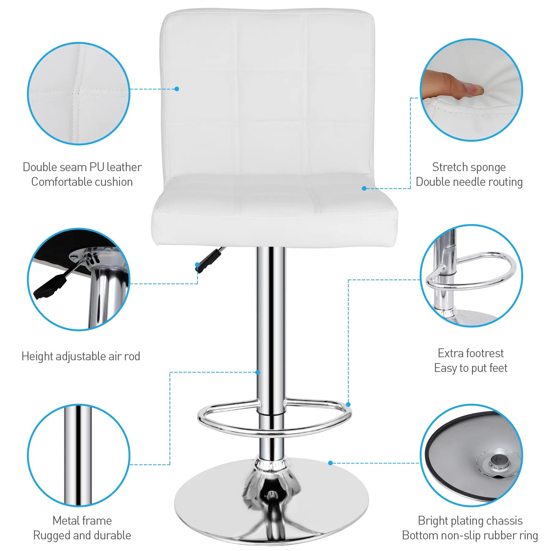 The modern sleek design is suitable for many interior looks. It can equally fit home bars and kitchen spaces. PU leather upholstery of the stools serves up high style. Each seat features a backrest, and high-density sponge padding for plenty of comfort and support. With the 15-inch large round base, which is made of chromed steel, this stool keeps upright and steady when in use, strong enough to hold up to 300lbs. The seat height is adjustable from 24-inch to 32-inch, the seat ensures 360-degree free rotation. The lower footrest prevents legs from dangling around. The base features floor protection equipped with a bottom rubber ring to prevent scratching the floor and reducing the noise when swiveling. Waterproof, easy to clean. Twice as easy to complete your home or office - have them standing together or separate them where wanted.