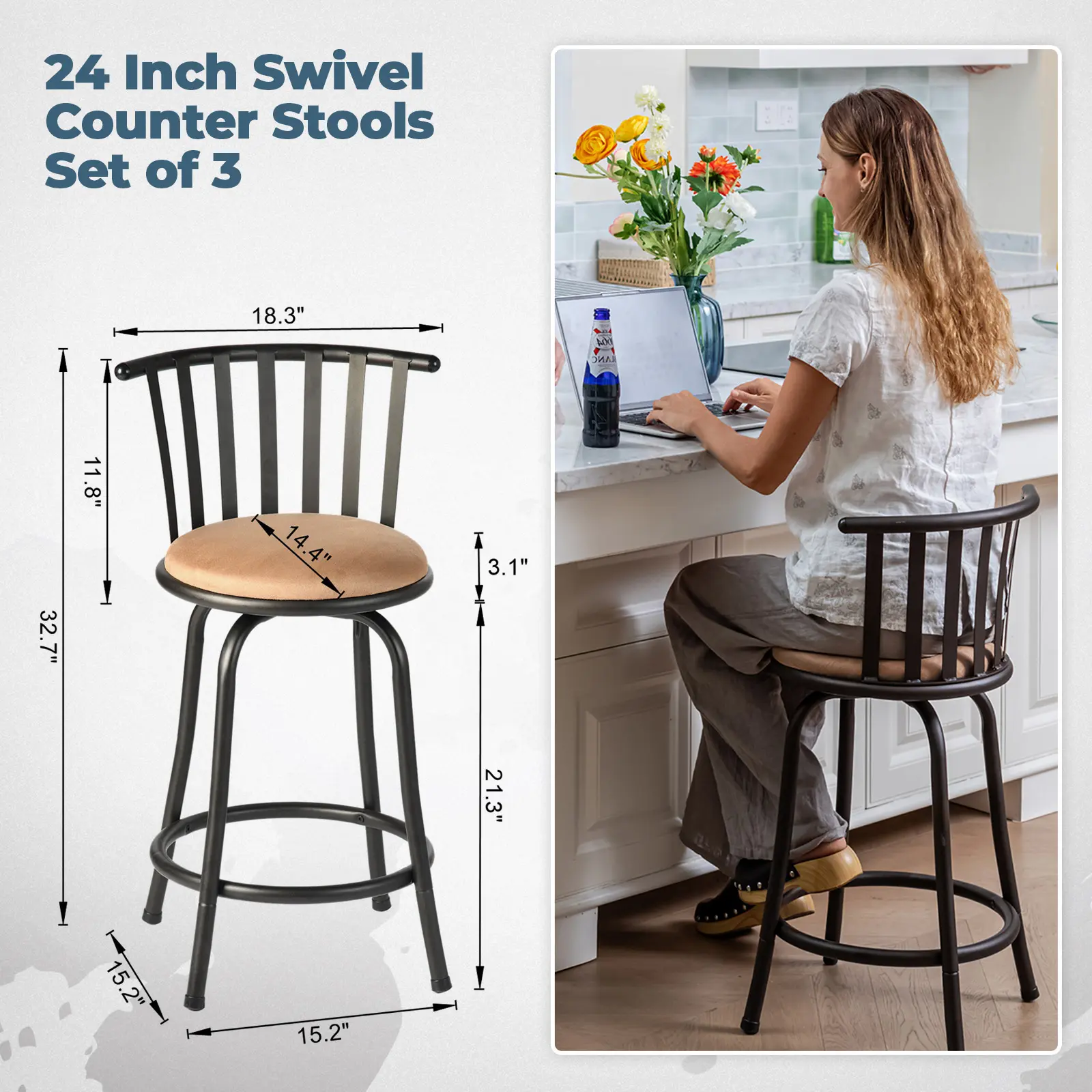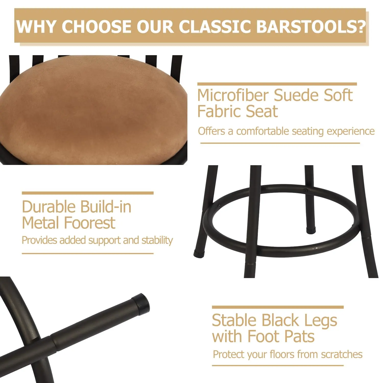 【Comfortable Seating】Each stool features a mid-back design with a plush suede cushion, ensuring superior comfort for extended sitting.