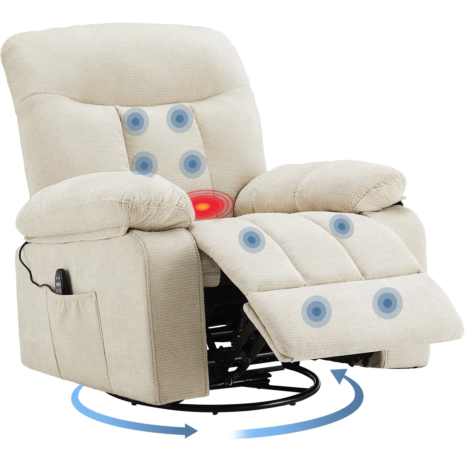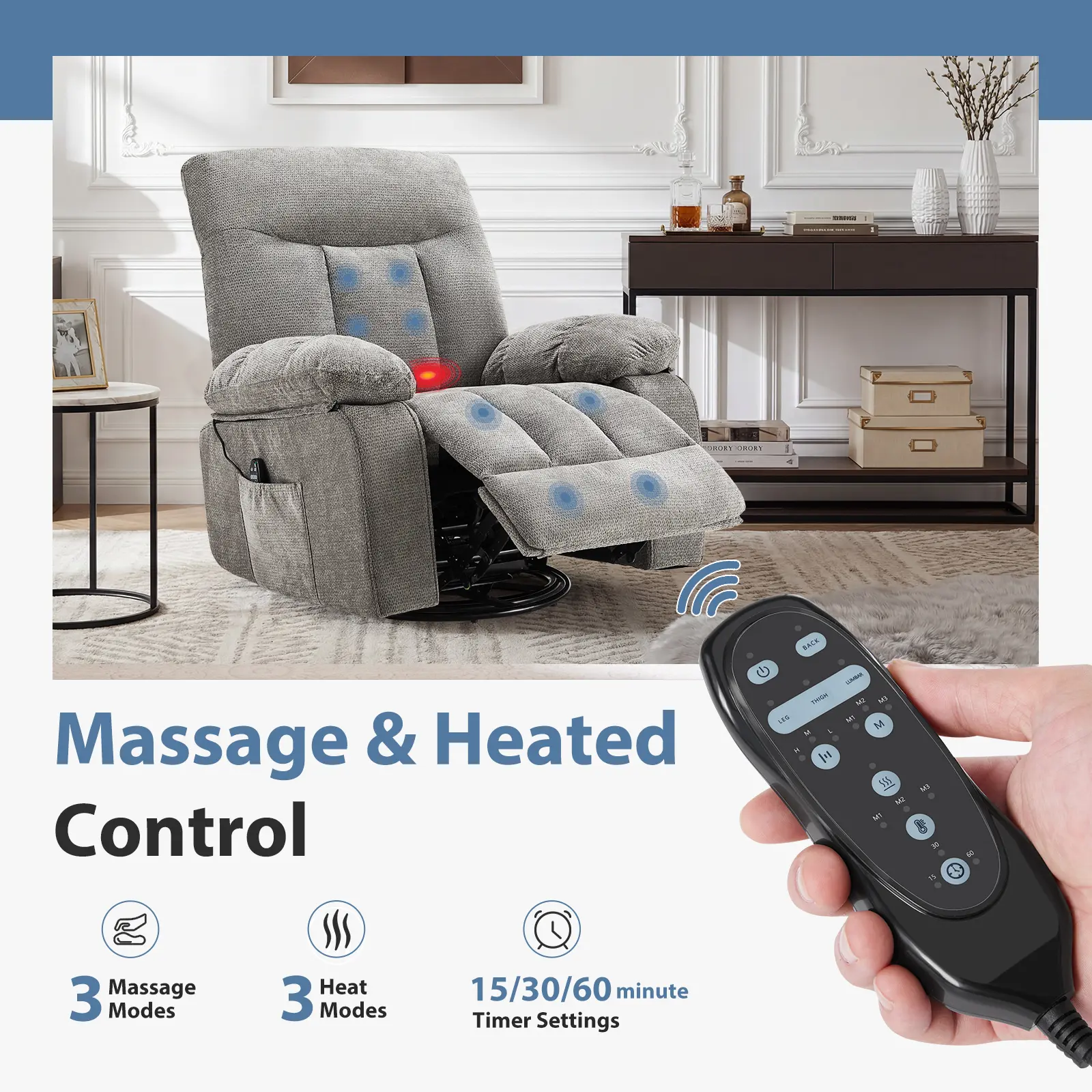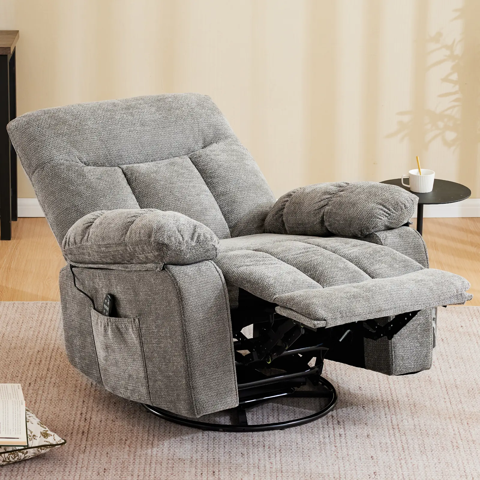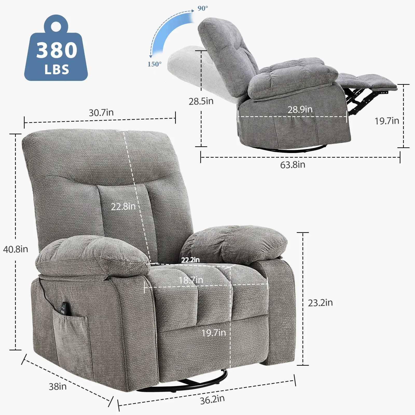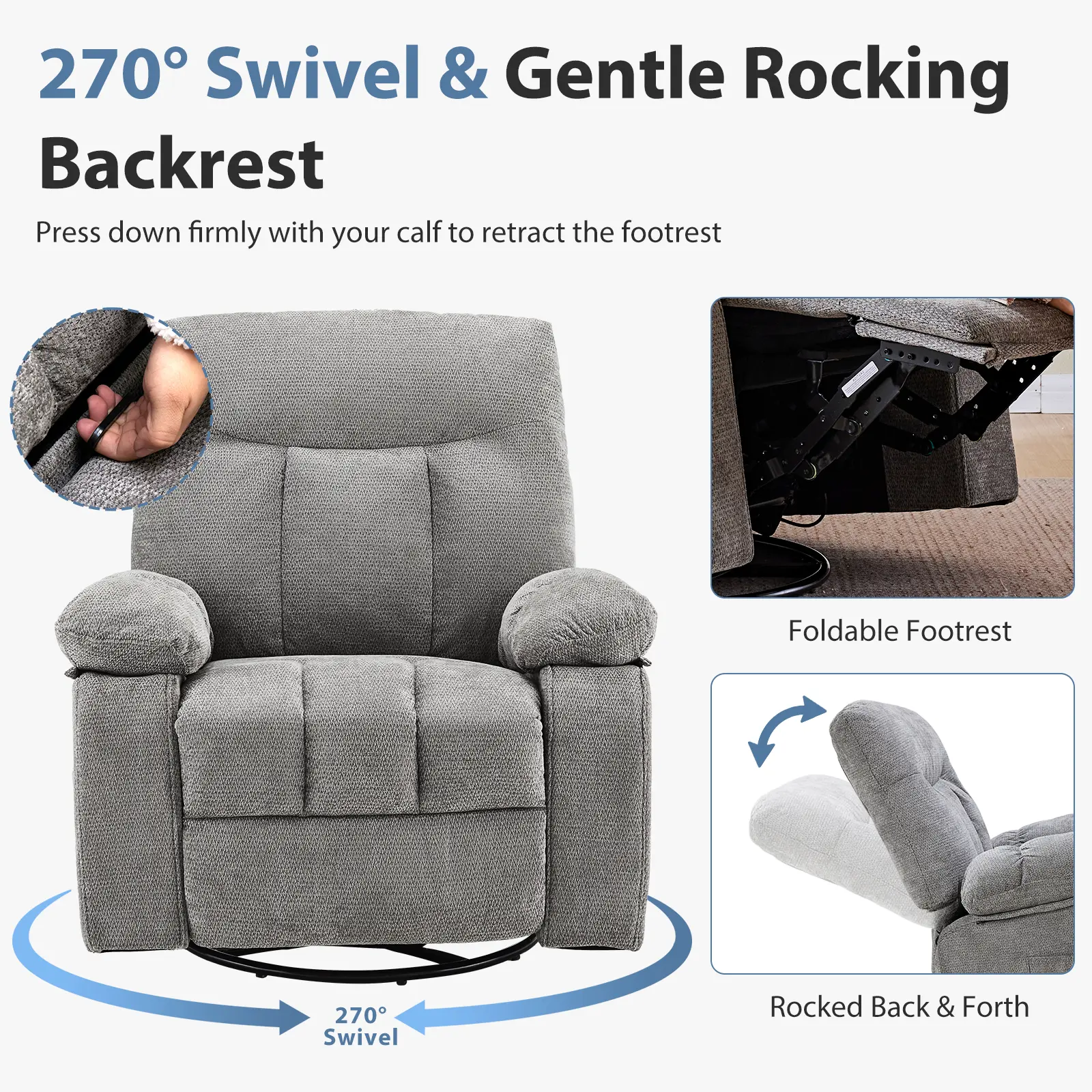 The swivel recliner chair is designed for everyday comfort. It features smooth swivel and gentle rocking for relaxing at home. The recline adjusts from 90° to 150° for sitting, resting, or napping. Soft chenille fabric is durable and easy to clean. Built-in massage and heat functions help relieve daily fatigue. A strong frame provides stable support. Easy to assemble and ready to use.