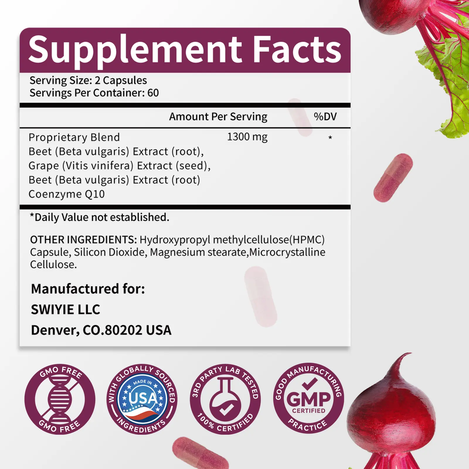 5. SWIYIE-Beet Root Capsules 120 pcs, Beetroot Supplement Support Heart Health Circulation, Blood Pressure, Beets with Grape Seed Extract, Non-GMO, Gluten-Free | 1300mg per Serving