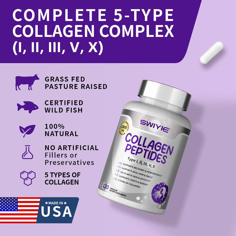 Elevate your health with SWIYIE's Multi Collagen Peptides Capsules! Each capsule contains 1800mg of hydrolyzed collagen, supporting skin, nails, bones, and joints. Perfect for women and men, these capsules offer types I, II, III, V & X. A 120-count pack ensures you have enough for your daily needs.