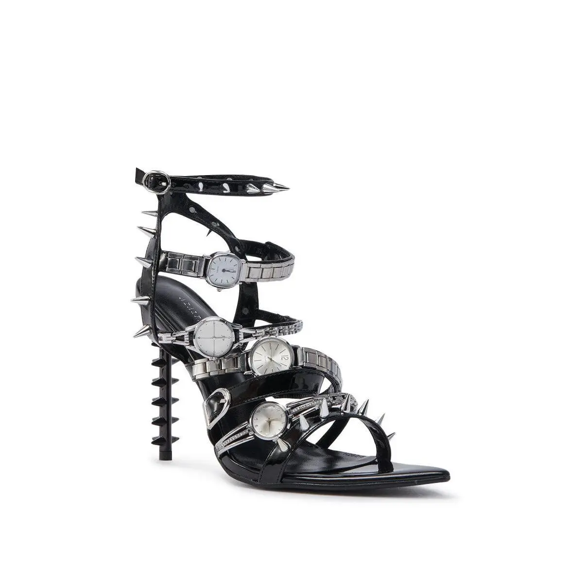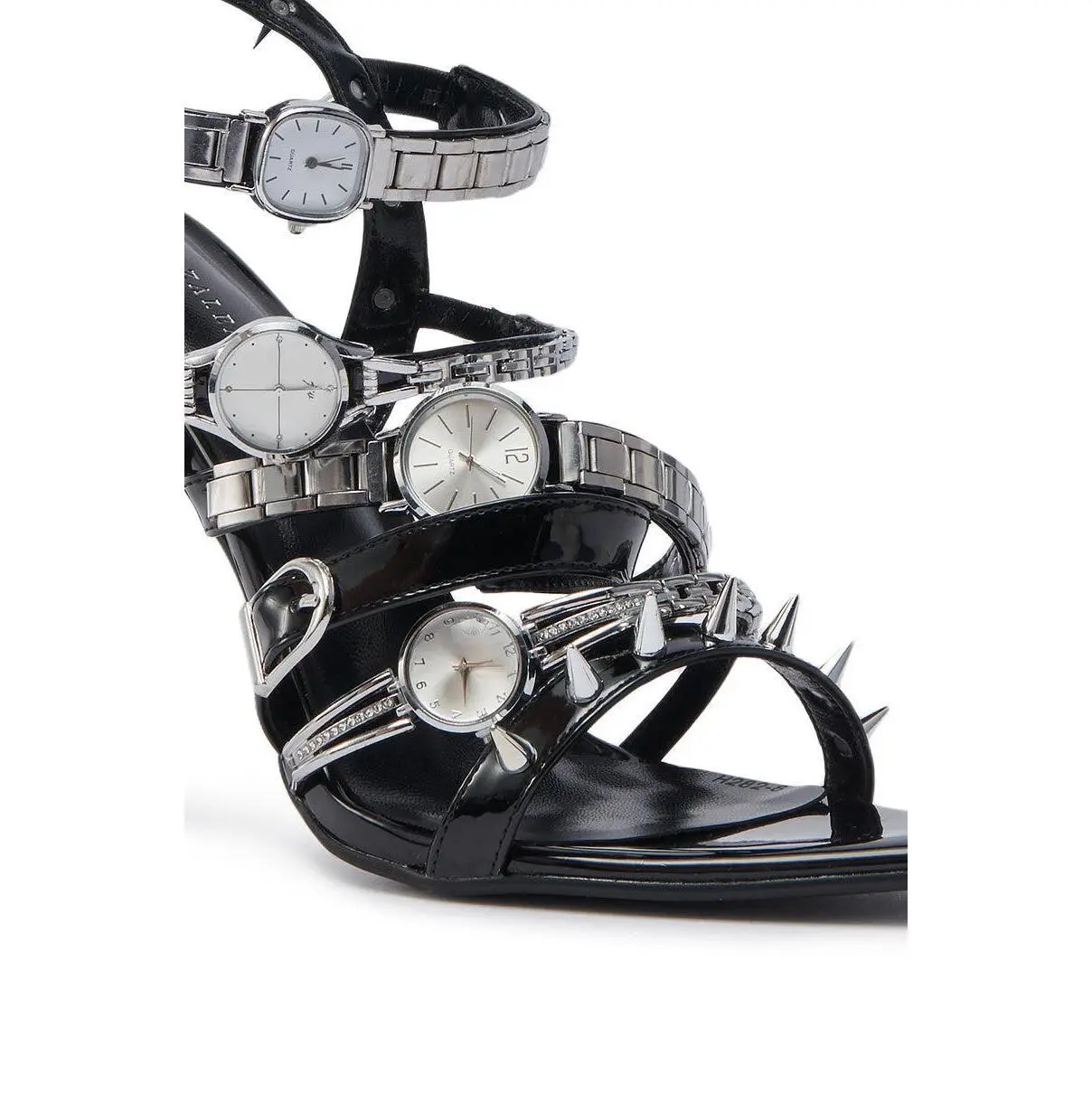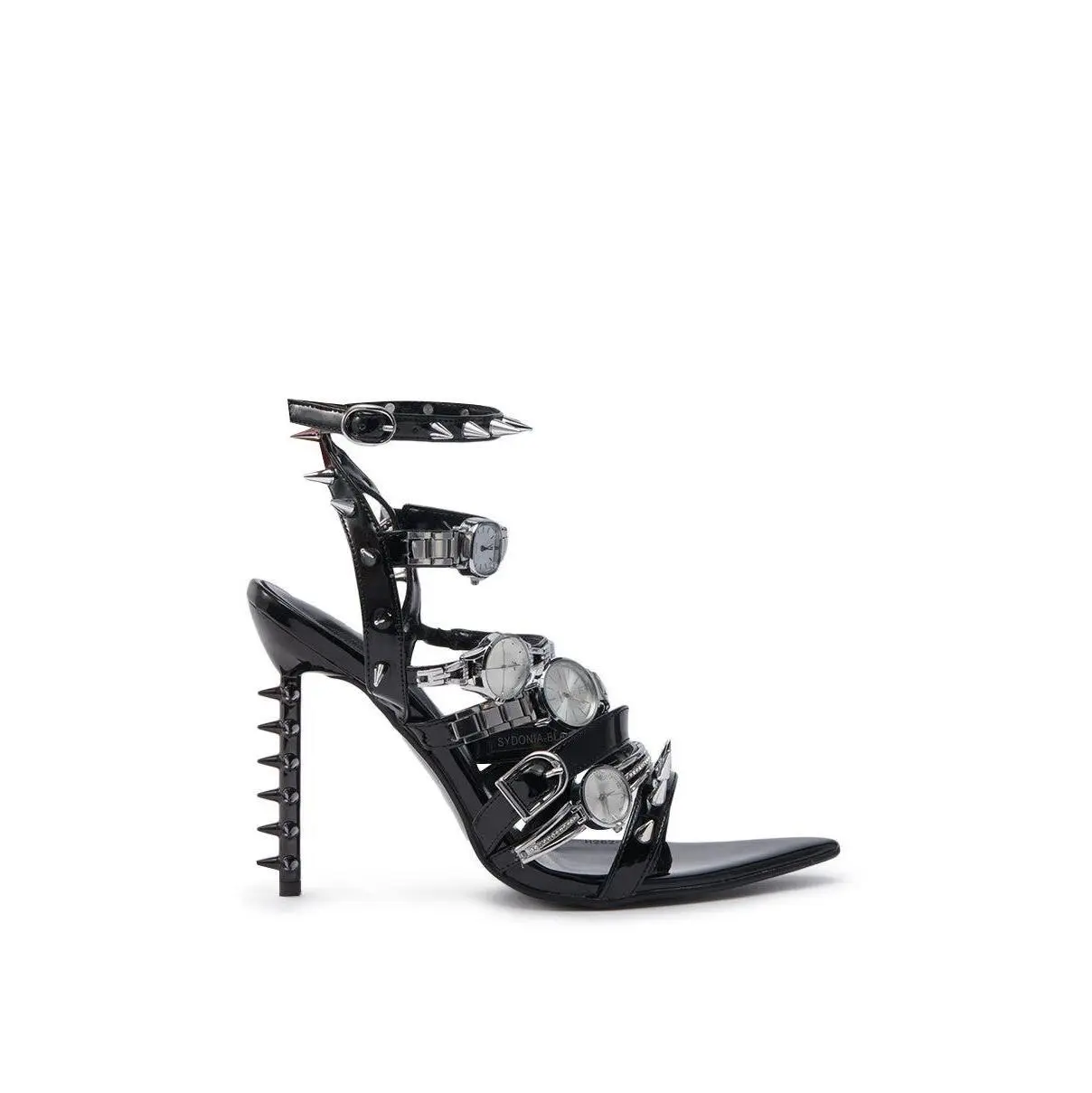 Make every second count in the AZALEA WANG Sydondia Black Watch Shoe Stiletto Sandal. Crafted from glossy patent faux leather, this cutie features an open pointed toe, a slim stiletto heel with tonal spiked detailing, and a series of edgy, adjustable ankle and foot straps adorned with faux silver metallic watch faces, rhinestone bands, buckles, and punk-chic spike hardware for a statement-making look. Complete with a cushioned insole, and a step-in fit. Equal parts rebellious and luxe, this sandal turns every step into a power move—perfect for fashionistas who live on their own timeline.(all measurements approximate from size 7.5)- Faux Leather Upper- Open Pointed Toe- Stiletto Heel- 3.5” Heel Height- ImportedProduct ID: 1042158