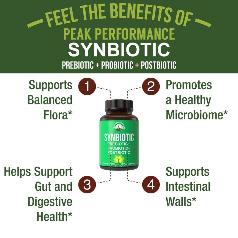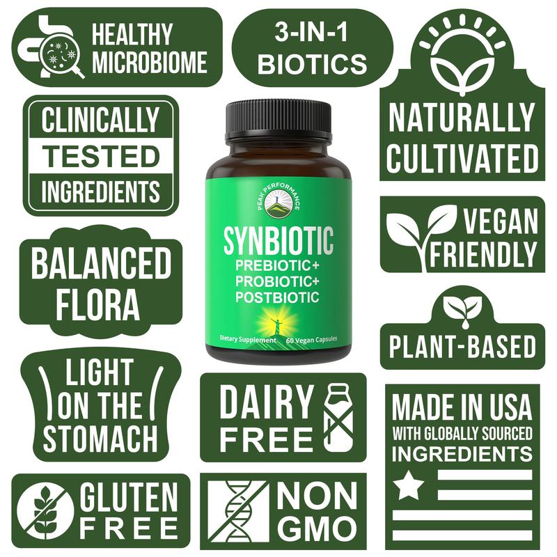 ·Don’t be fooled! Not all prebiotics or probiotic supplements cover all bases. Peak Performance Synbiotic is a Prebiotic + Probiotic + Postbiotic 3-in-1 capsule supplement specifically designed for allround digestive, gut, gastrointestinal health, as well as immune health.* Made with a Prebiotic Complex, Soil-Based Probiotic Blend and clinically tested CoreBiome Tributyrin 55% Extract.
