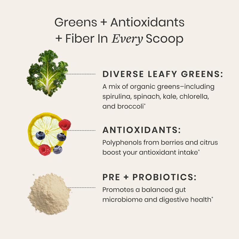 Clinically studied in women, our greens powder contains a diverse mix of organic leafy greens, antioxidants, and pre and probiotics. Our pregnancy- and breastfeeding-safe greens powder was formulated to support gut, digestive, immune health, and daily wellness without added sugar.* This greens powder is safe to pair with your existing multivitamin routine and tastes great mixed into a glass of water or your daily smoothie.