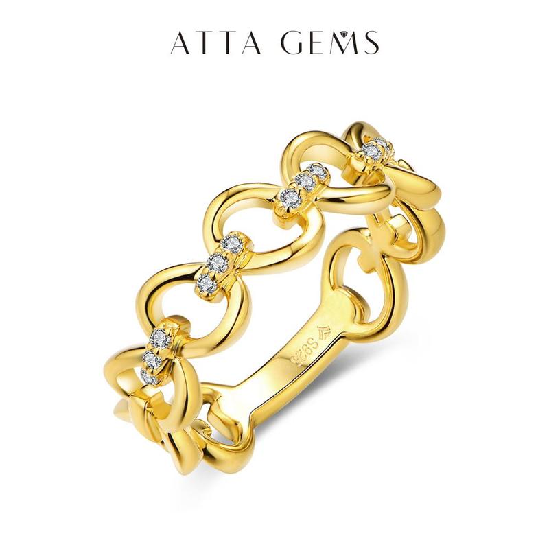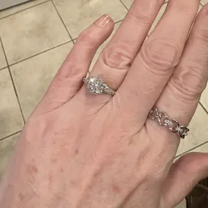 This is a Moissanite ring I wear on my pointy finger. It doesn’t slide around because the back is flat. It sparkles just like a Moissanite should. I love AttaJems. They have quality products. This has become one of my favorite rings because it’s so comfortable and versatile.