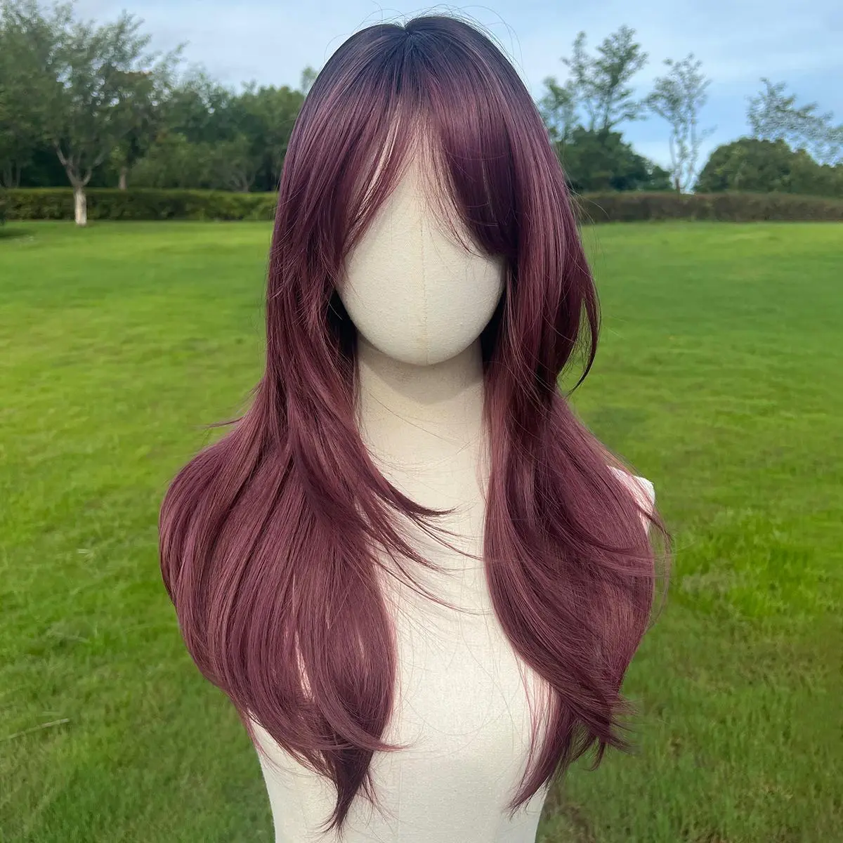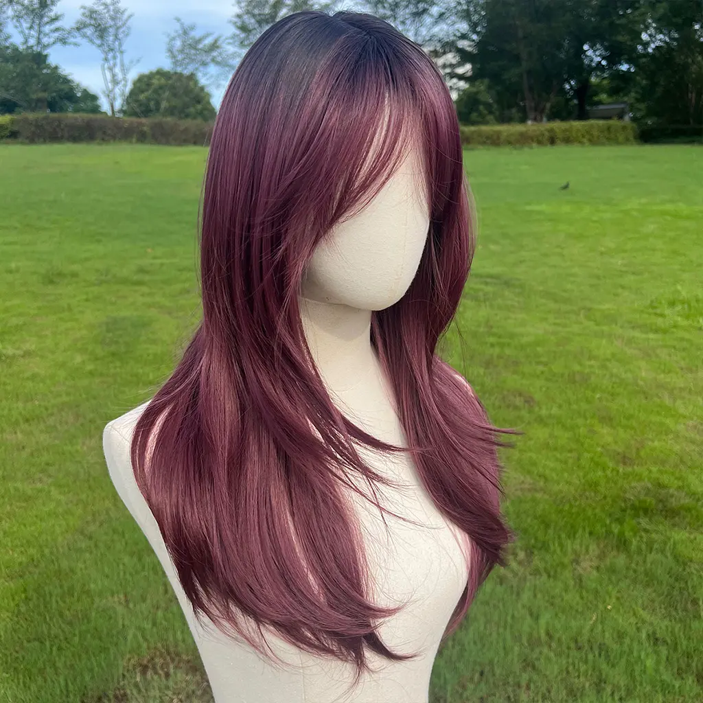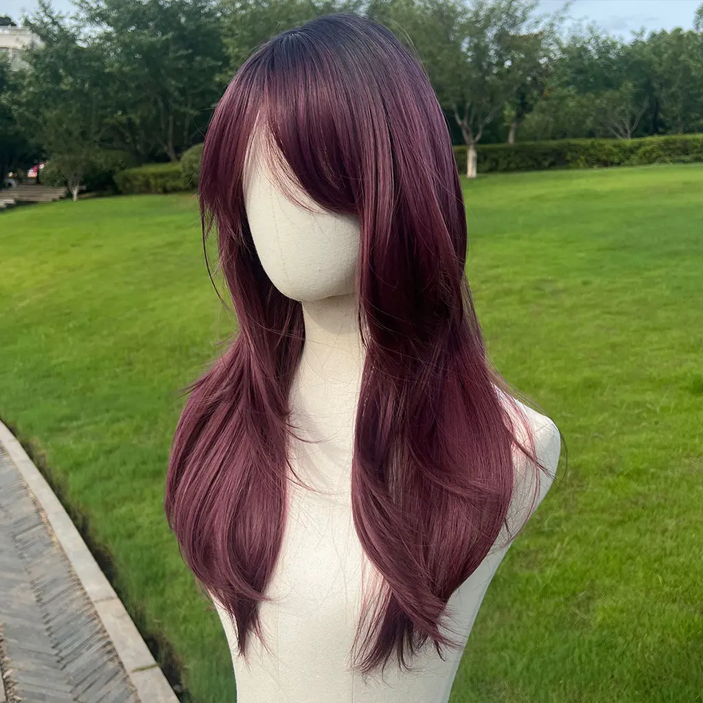 SMILCO/24Inch Berry Red Slightly Curly Synthetic Wig With Bangs/SM256