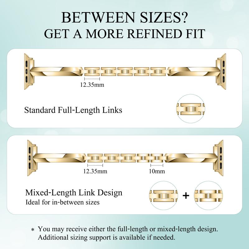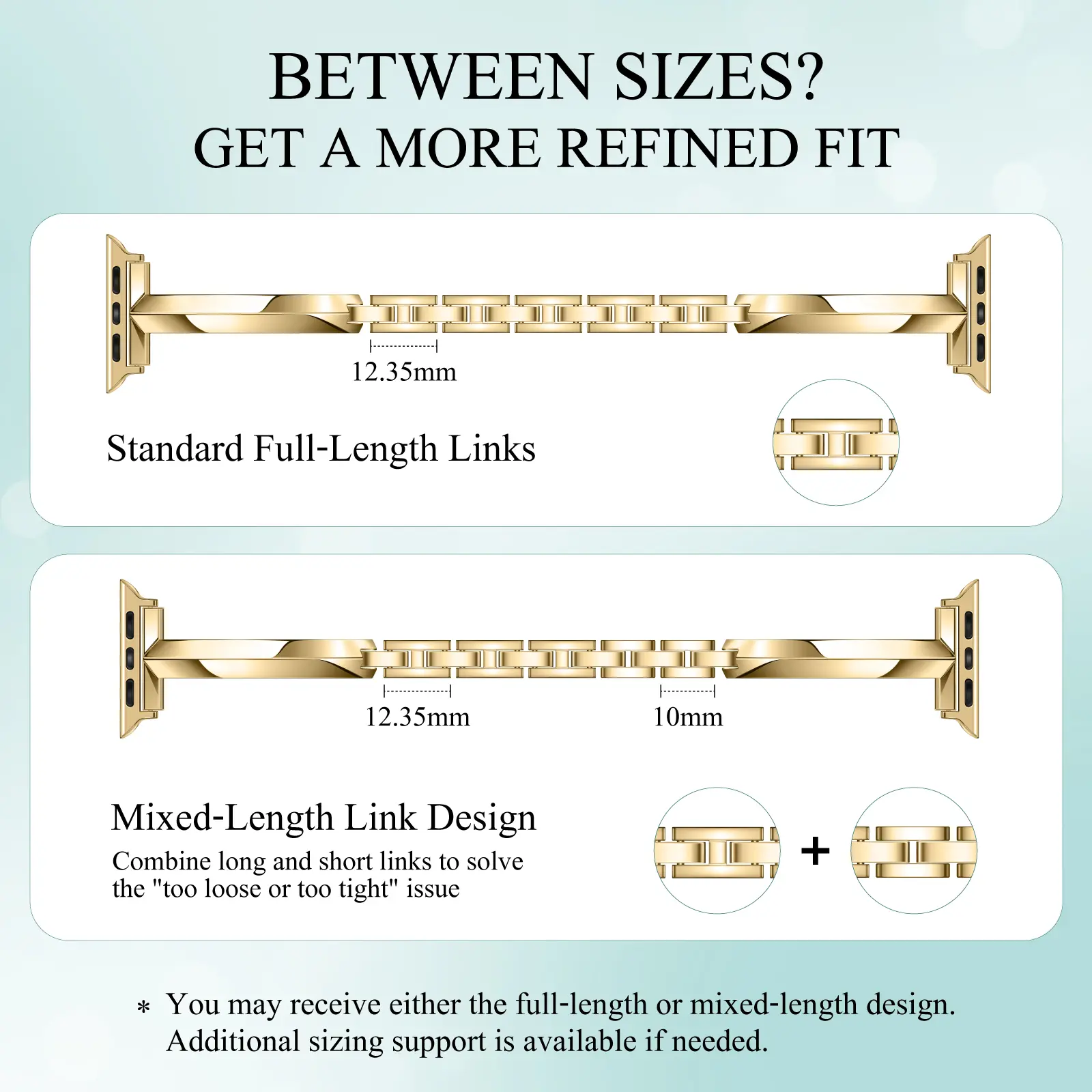 I purchased the T style & the Love style in gold 38mm. The adjustable links were perfect for me the T design but had issues with the length of the Love style either being too tight or too loose. Customer service messaged me and sent me shorter links to further customize the band! Thanks so much!!