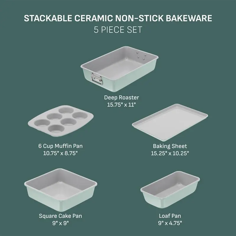 Designed to Stack: 5-piece baking set with a stackable all-in-one design that stacks neatly to save space and keep your kitchen organized. Includes a Baking Sheet, Roasting Pan, Loaf Pan, 6-Cup Muffin Pan and Square Pan.