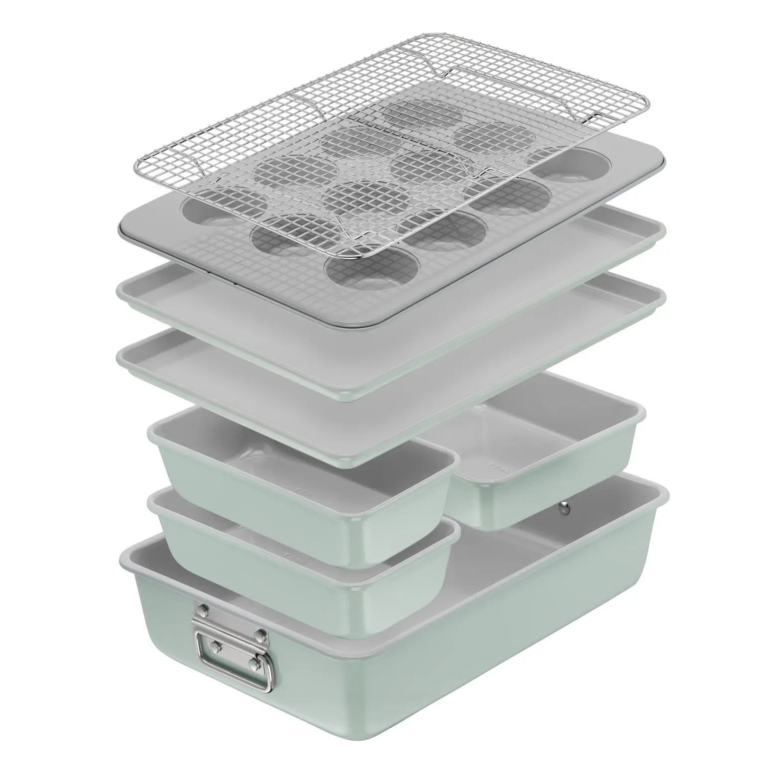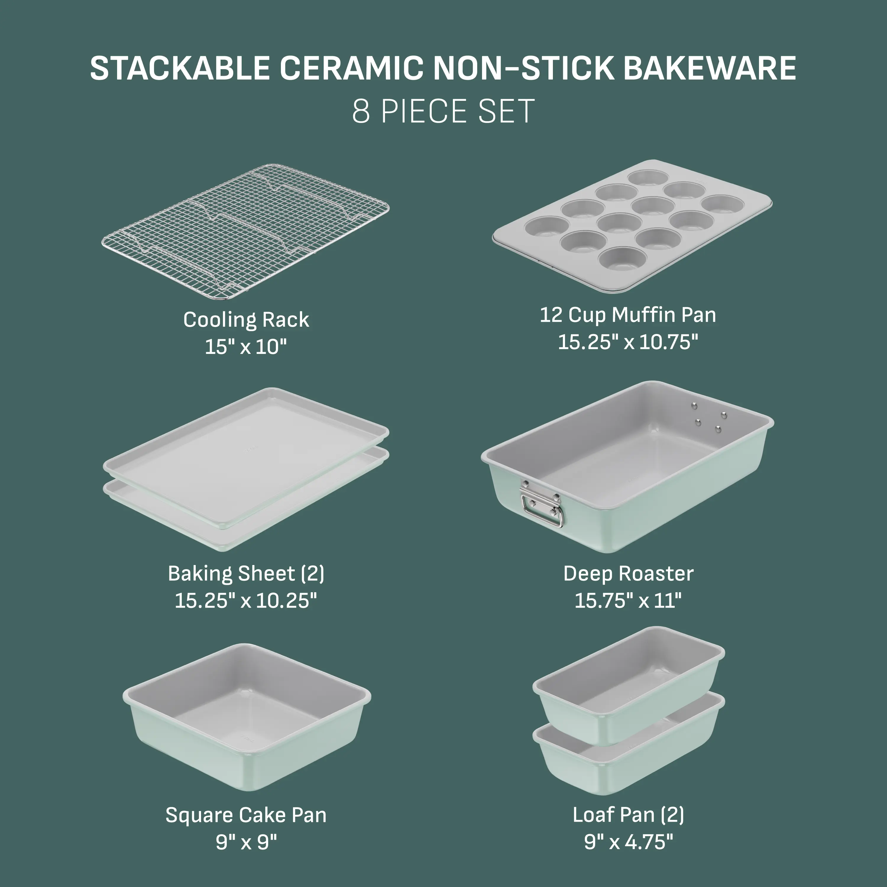 ·Designed to Stack: 8-piece baking set with a stackable all-in-one design that stacks neatly to save space and keep your kitchen organized. Includes a Roaster, Cooling Rack, two Baking Sheets, two Loaf Pans, a Square Cake Pan and a 12-Cup Muffin Tray.