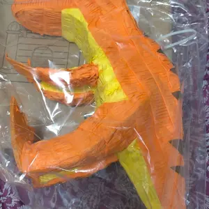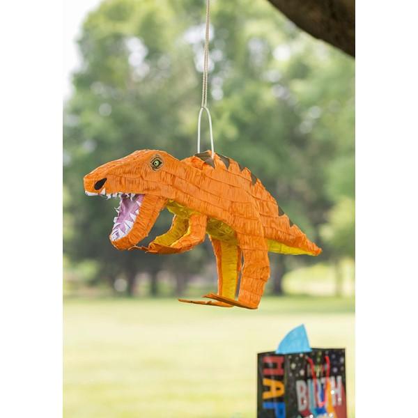 Your guests will love taking on this exclusive T-Rex Dinosaur Party Pinata Decoration at your next celebration! The cardboard pinata is completely covered in yellow, orange, and brown tissue paper. It's decorated with printed paper eyes and an open cardboard mouth that's lined with pink tissue and white paper fangs. A tissue-covered hole in the neck allows you to fill its hollow body with prizes.