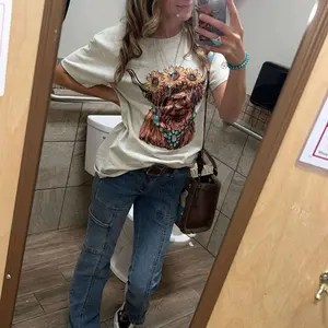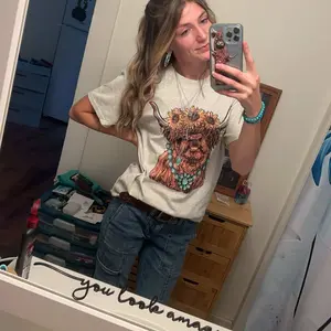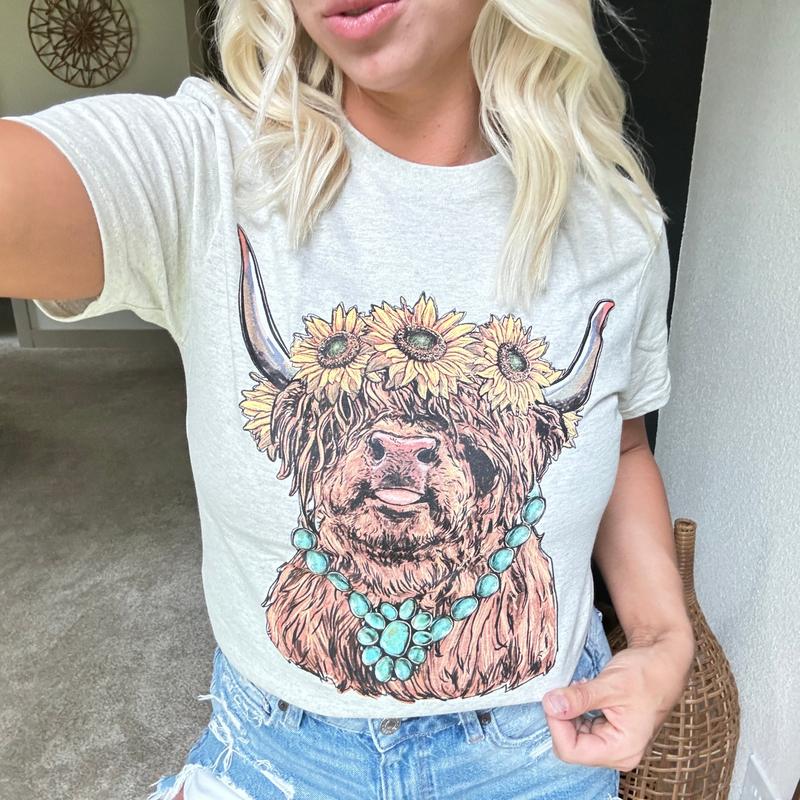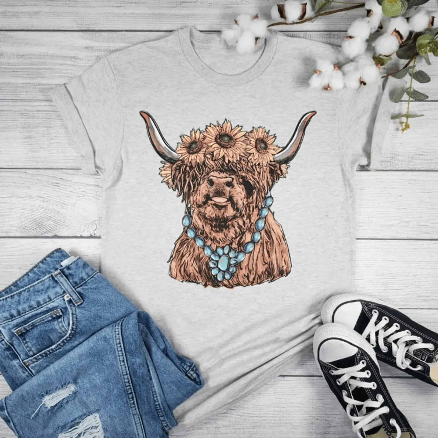 This charming t-shirt features a delightful design of a highland cow wearing a sunflower headband, adding a touch of whimsy to your wardrobe. Made from soft and comfortable fabric, this shirt is perfect for casual outings or lounging at home. The unique graphic is sure to make you stand out in style.