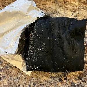 I was excited about this shirt for my husband, this is how it came out of the package. Not sure if this is wood chips or what but I immediately put it in a sealed ziplock bag and returning it.