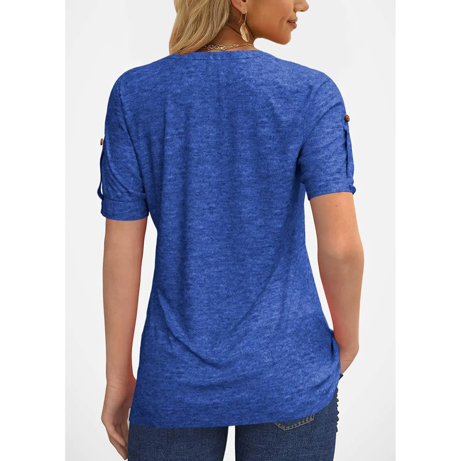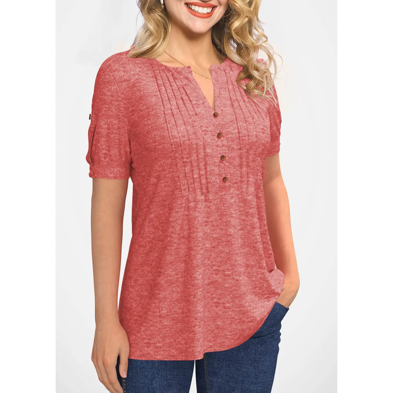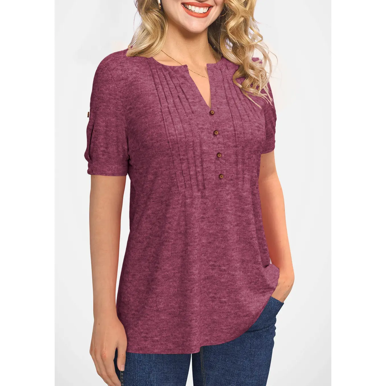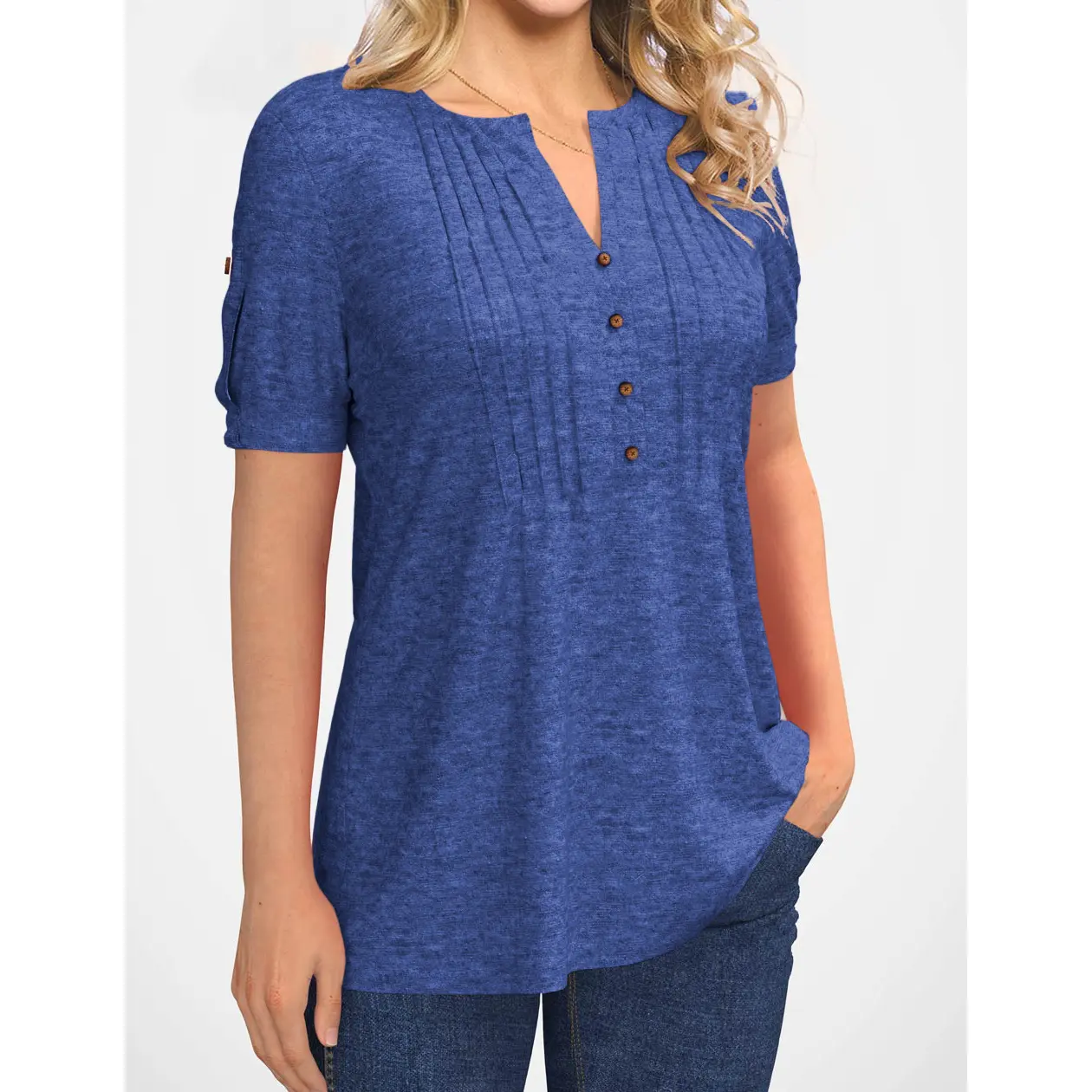 Features:Pleated T-shirts , solid short sleeves, button design, V-neck, very slim version makes you look very slim.