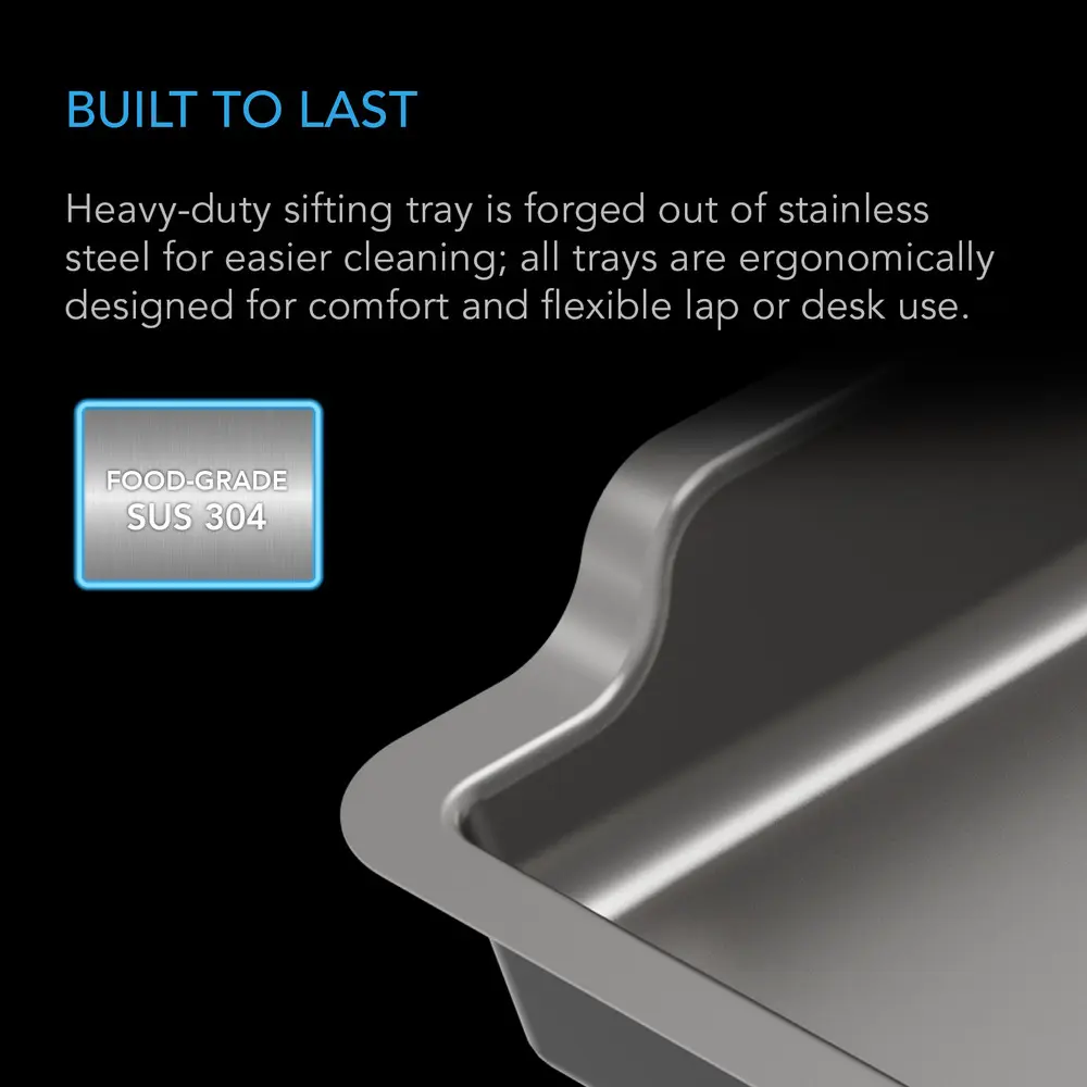 A premium plant trimming system designed to help you process finely harvested herbs, buds, flowers, and more. Its interchangeable design features a 150-micron sifter screen and ABS 757 sorting screen that can be quickly swapped, giving you the flexibility to process smaller or larger plant trimmings. The sifting tray is constructed from food-grade stainless steel, supporting easy cleanup after each session to prevent unwanted residue build-up. This optimized surface also allows you to fully collect pollen and other fine plant material without it getting stuck. The sorting and sifting trays let you trim plants on your lap or your desk, while the top layer trim tray’s walls are elevated to keep your trimmings safely contained. The trim tray is also ergonomically shaped to maximize comfort while you are working.