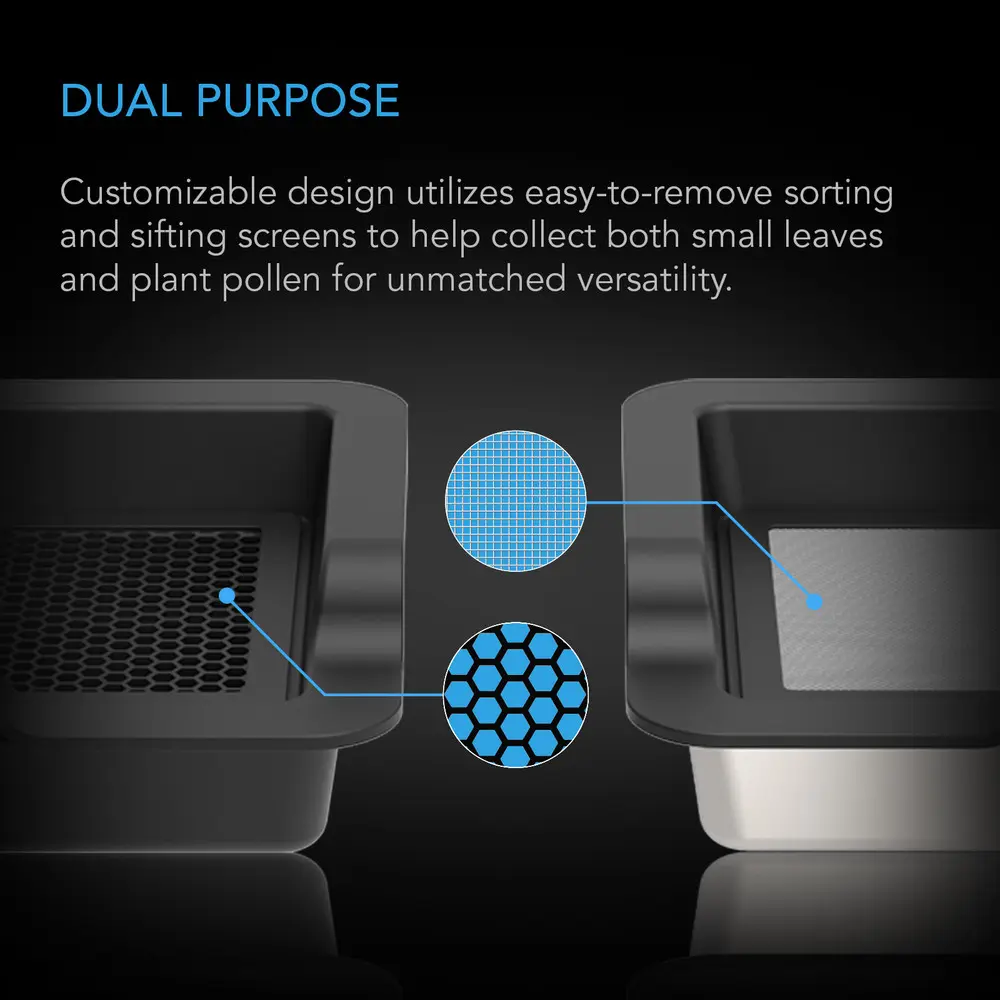 ·Interchangeable 3-tray kit with sorting and dry sift screen is optimized for catching small leaves and pollen.