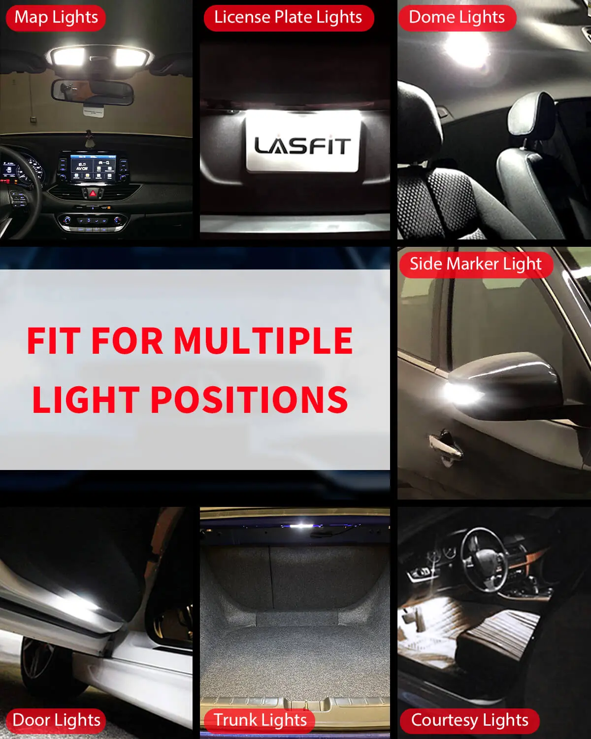 LASFIT offers you the different choices of the high-performance 6000K bright white light or cool blue, ice blue, amber yellow, red, green, purple, etc for a more stylish auto interior light bulbs. Extremely bright light will help you see more clearly around the trunk, the glove box, and inside the car.