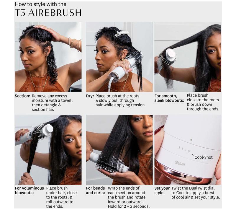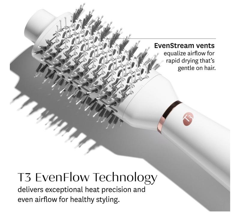 Meet your one-step solution for faster styling and the appearance of healthy-looking blow-outs. Designed to dry and style in one go, the T3 AireBrush hair dryer brush delivers exceptional heat precision and even airflow for fast drying and styling. EvenStream vents equalize airflow to speed up styling. An oval brush design with perfect SmoothGrip bristle placement and a CeraGloss ceramic surface works to help smooth the look of strands, create bends, and give the look of volume.
