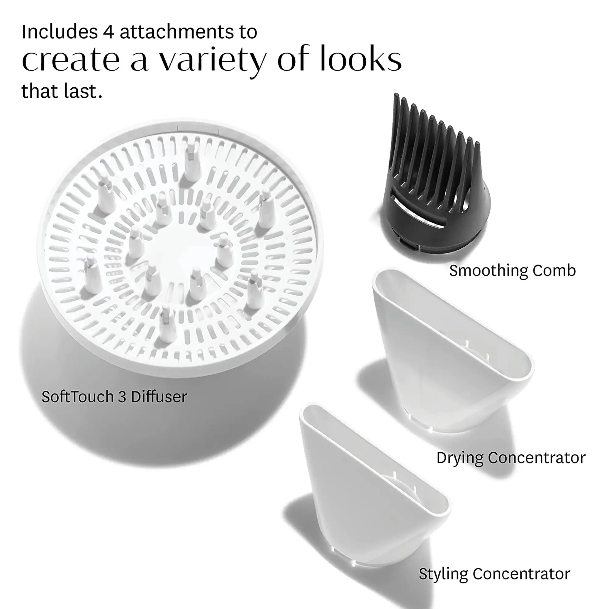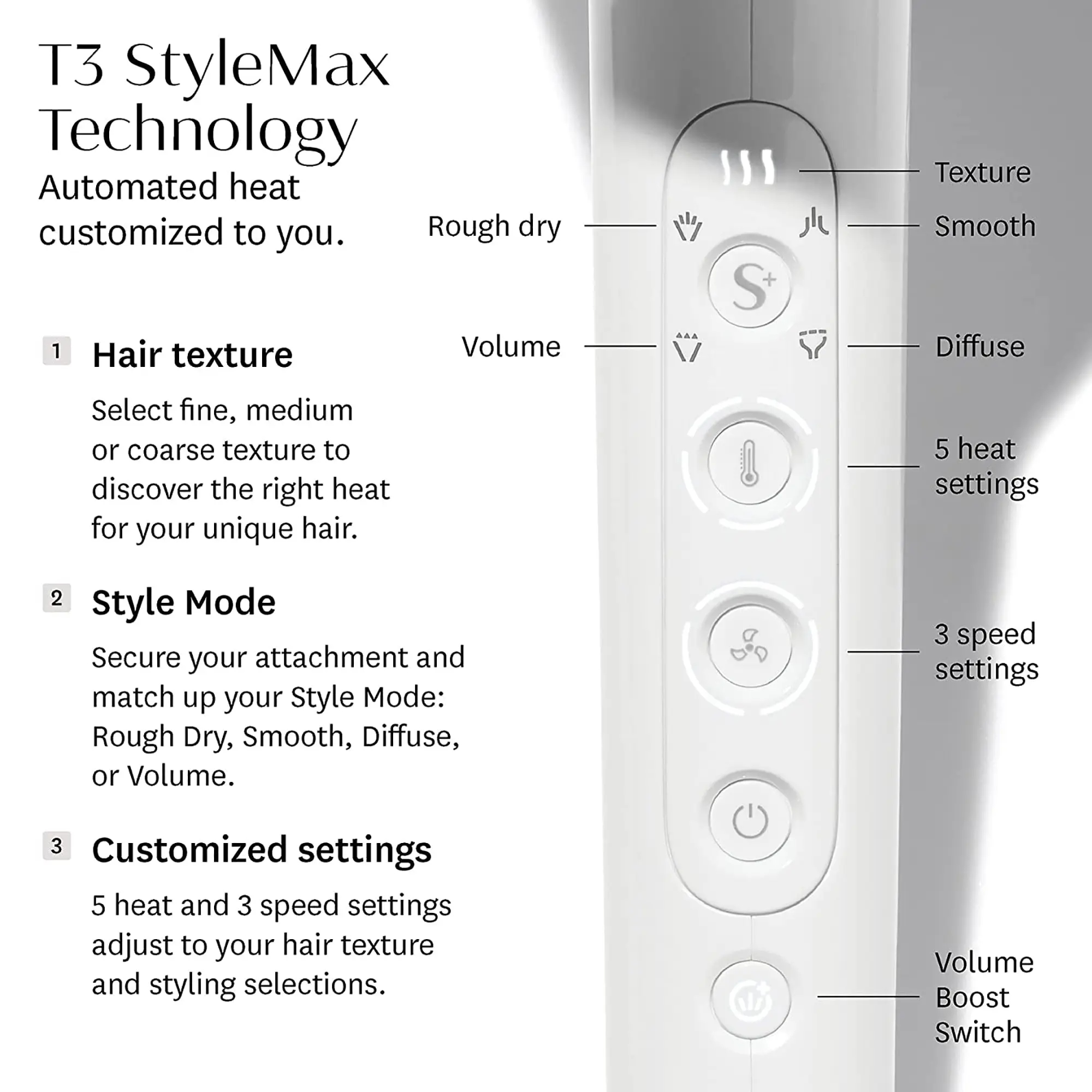 Meet your perfect heat match! The T3 Featherweight StyleMax professional hair dryer auto-customizes heat and airflow to your hair texture and styling goals. For better results with less damage, this set is your go-to. It includes four attachments paired with four unique Style Modes. Choose from rough dry, smooth, diffuse, or volumize options. Discover your custom settings for faster drying and a shiny, frizz-free finish.