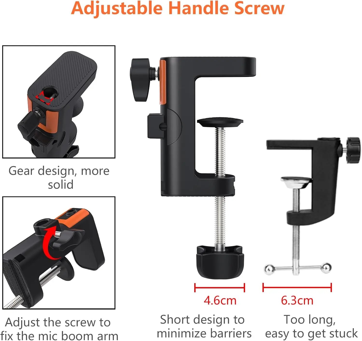 【 Material Base】 Heavy-duty upgrade table mounting clamp is made of plastic, and the reinforced solid plastic base is very sturdy and long-lasting. (Note: Hole diameter over 0.47inch/1.19cm cannot be installed)
