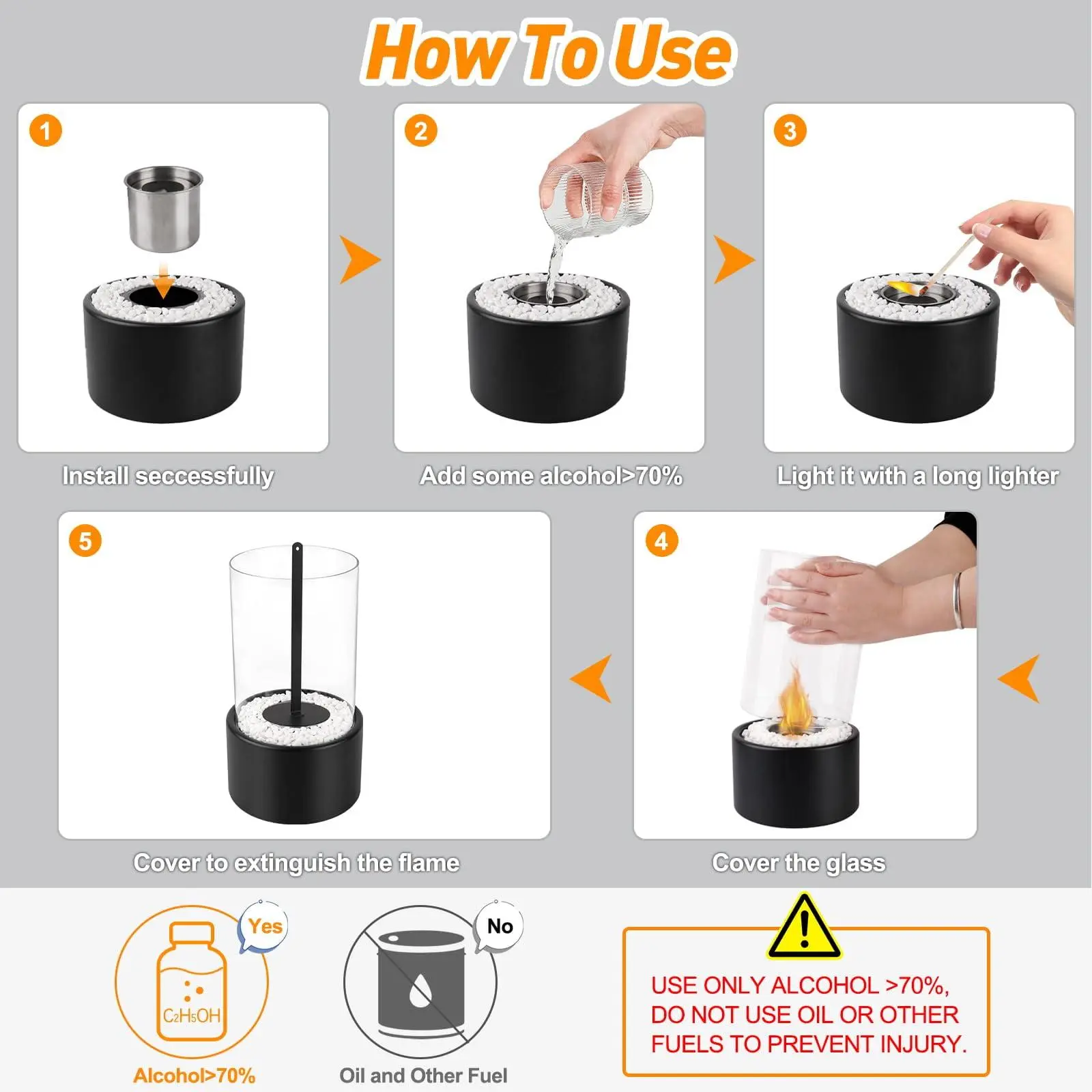 Do not buy!!! It does not last long and you have to keep refilling only after a couple of minutes, then when it gets low, it soots up and the glass turns black!
