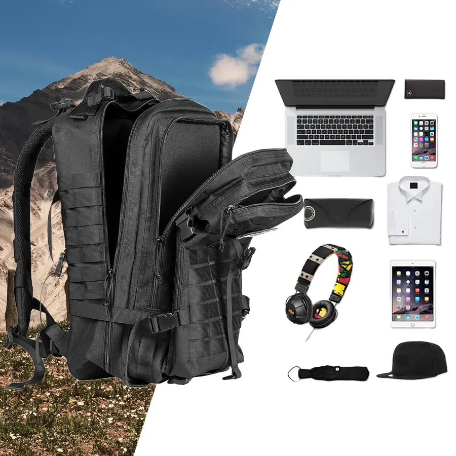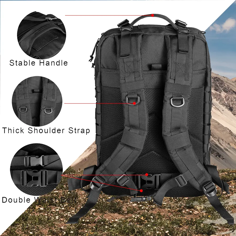 【Versatile With Multi-Compartment】This tactical assault pack has 2 main compartments, 2 smaller Compartments in the front, and a compartment in the back for a hydration bladder. Each compartment has a variety of pockets to accommodate your various storage needs.