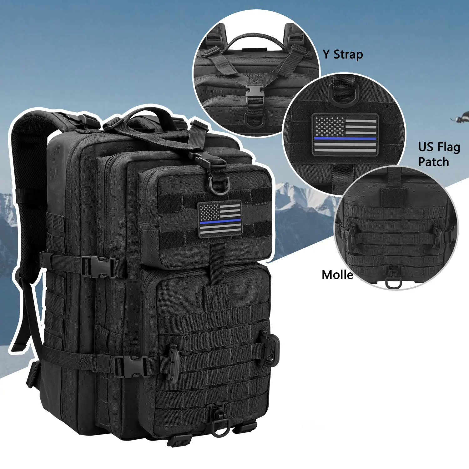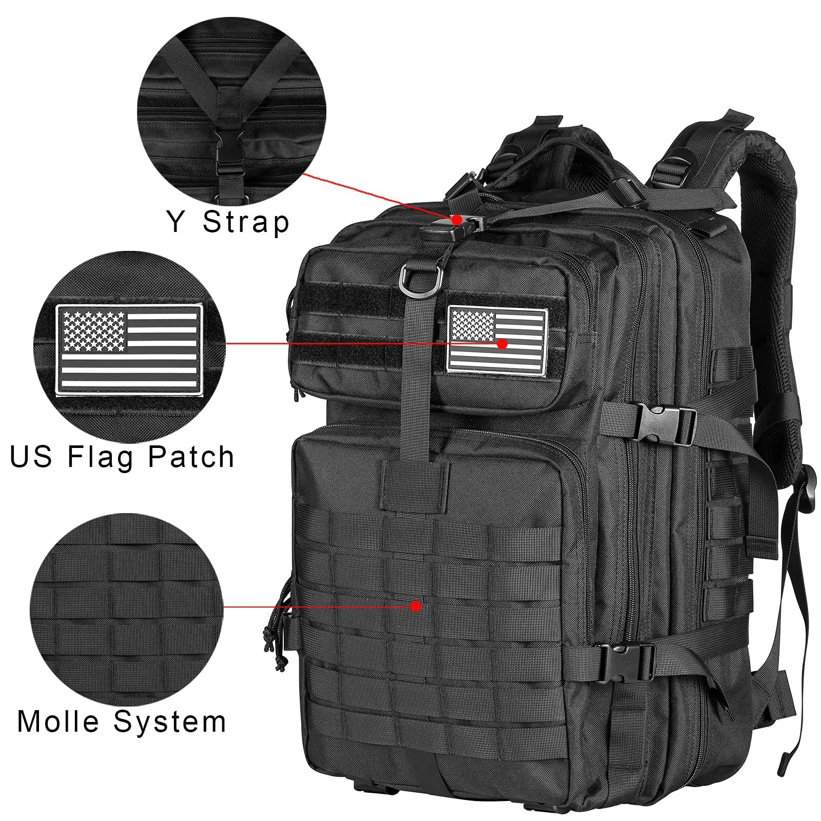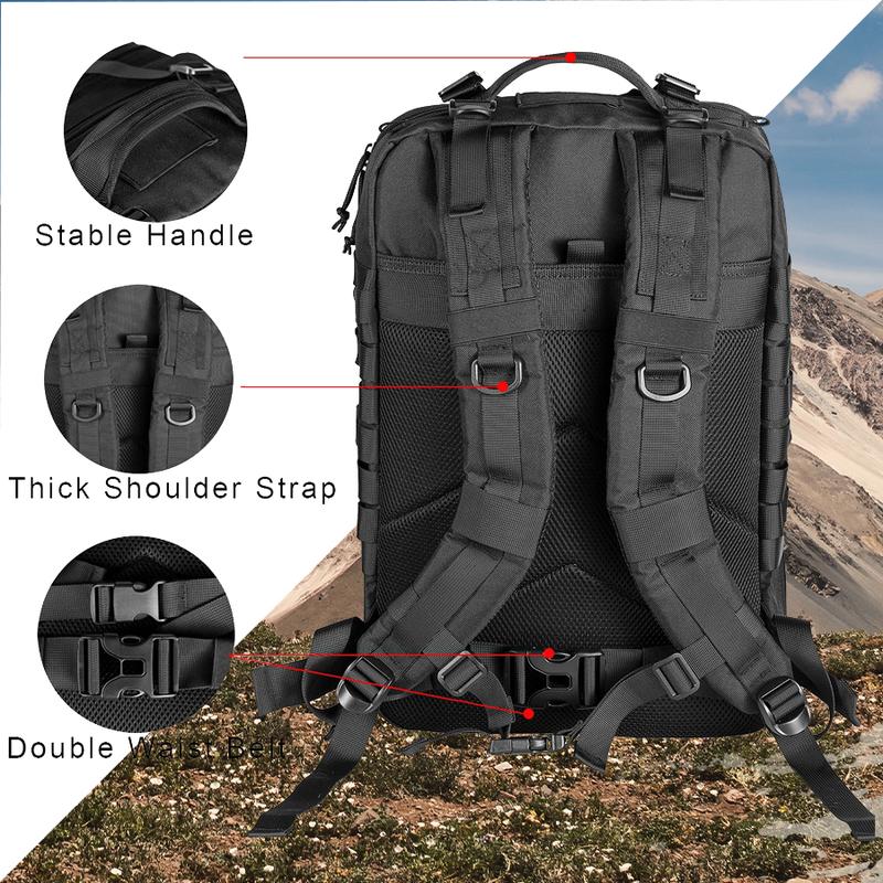 【MOLLE WEBBING DESIGN】Equipped with the MOLLE system on the front and sides, the MOLLE webbing is used to attach additional tactical pouches or gear as a 3-day Assault Backpack Combat MOLLE Backpack. The front Y-shaped straps and buckles are perfect for rolling up a sweatshirt or light jacket. Bottom straps can be used to secure a tent or sleeping pad.
