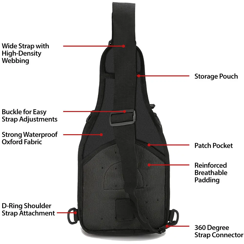 - Innovative single-handed sling shoulder design. - Main compartment with two pockets and front lower compartment with elastic organizer loops and key holder. - With spacious main compartment with zipper closure, mesh pockets and front zipper organizer compartment