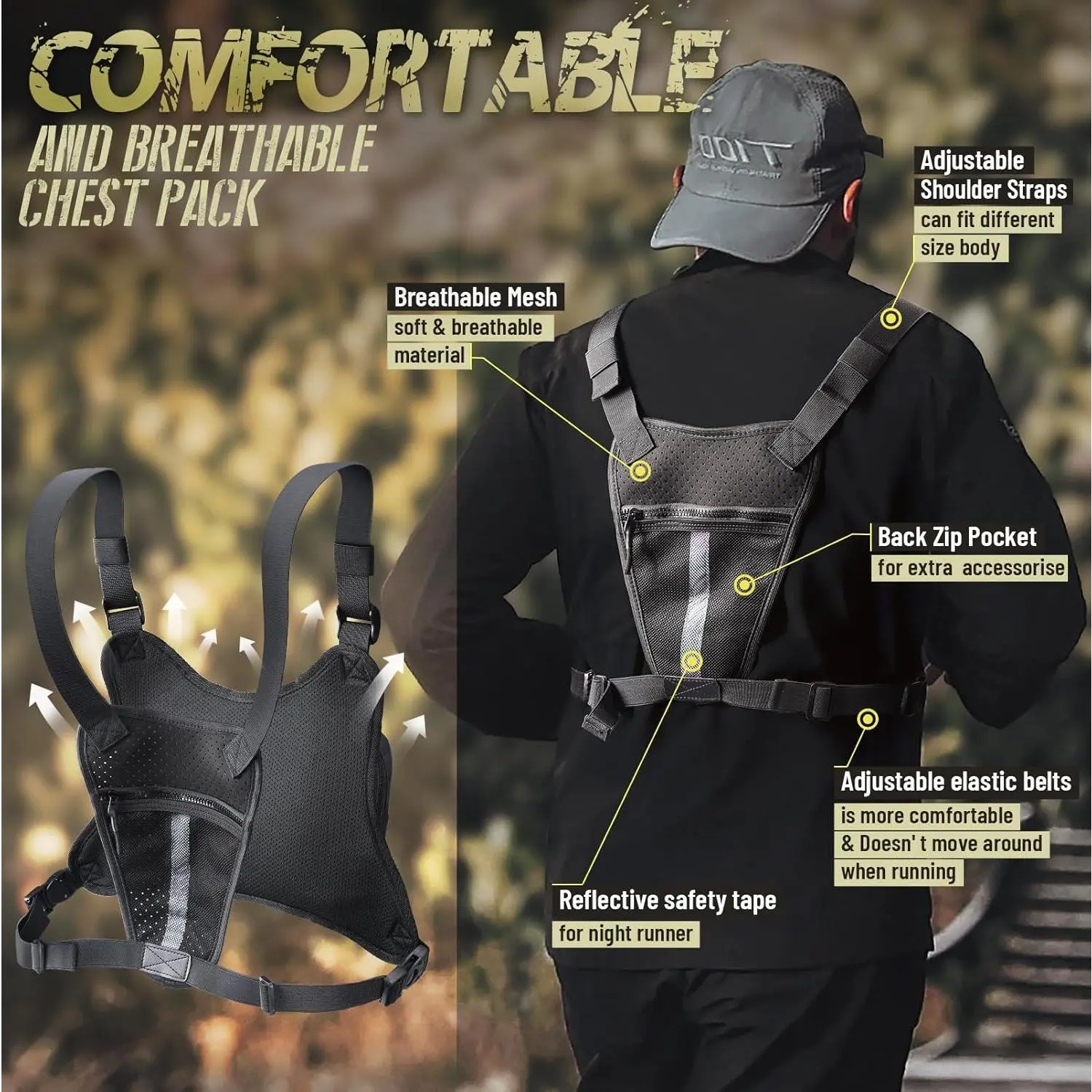 Comfortable & Great for Sport: The back of this chest pack bag is made of breathable mesh material that keeps air circulating to accelerate heat loss and reduce discomfort during exercise. back zipper pocket holds a water bottle for riding/running/hiking, and reflective safety tape ensure the safety of night runners.