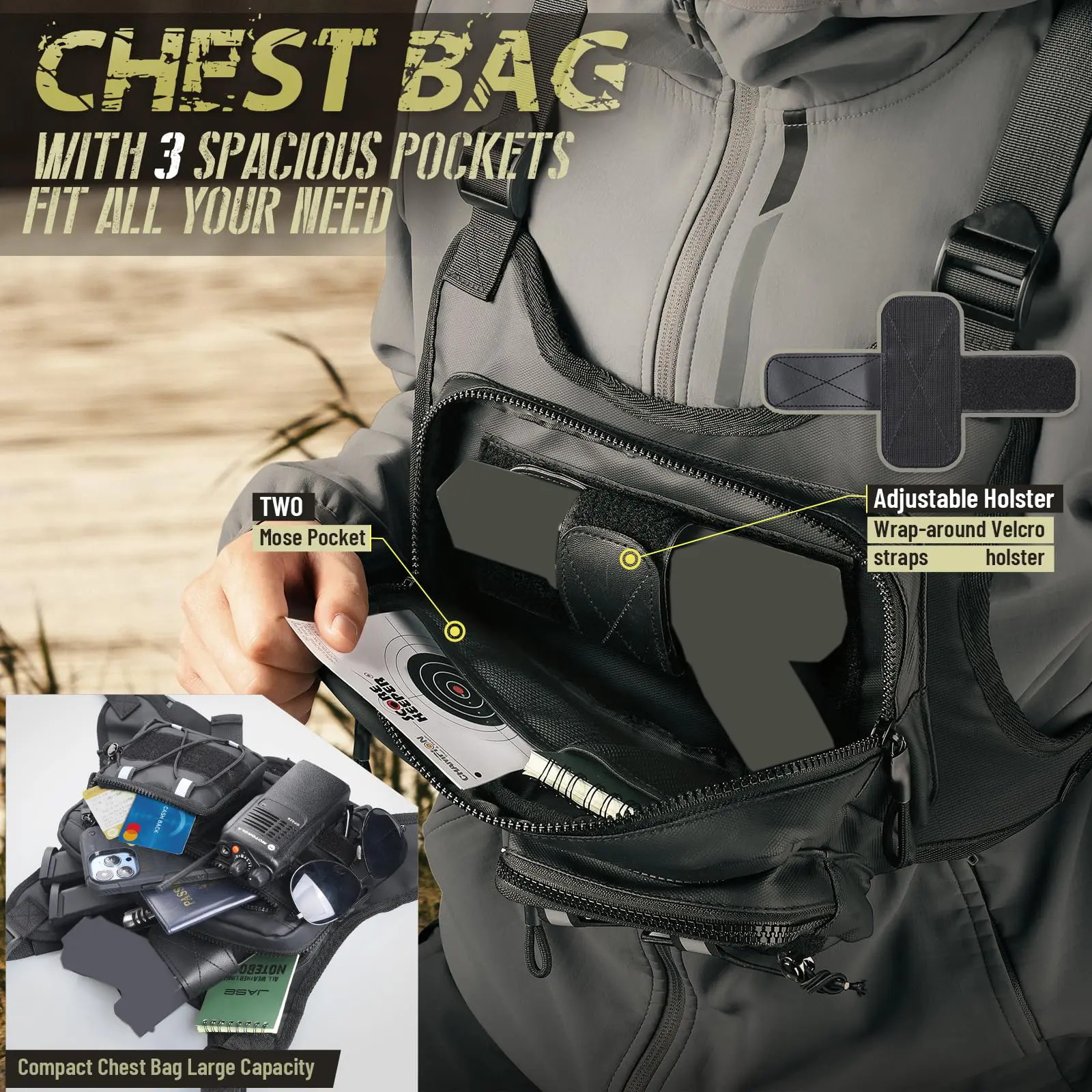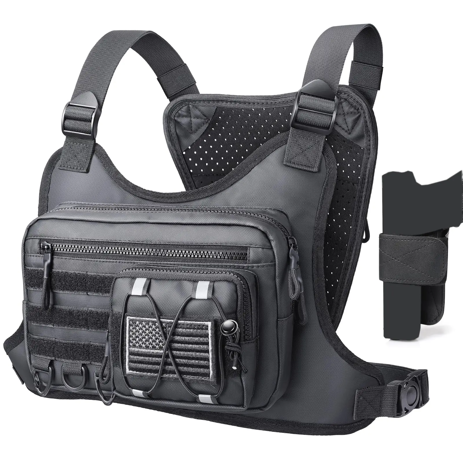 Reasonable Capacity: Chest pack (size: 9.8“ x 6.3” x 2.5") features 2 mesh pockets inside the main compartment for organizing headphones, keys, etc., and a loop closure on the main pocket for use with a holster. The front of the chest pack features a zippered pocket and an EDC pocket for quick access.