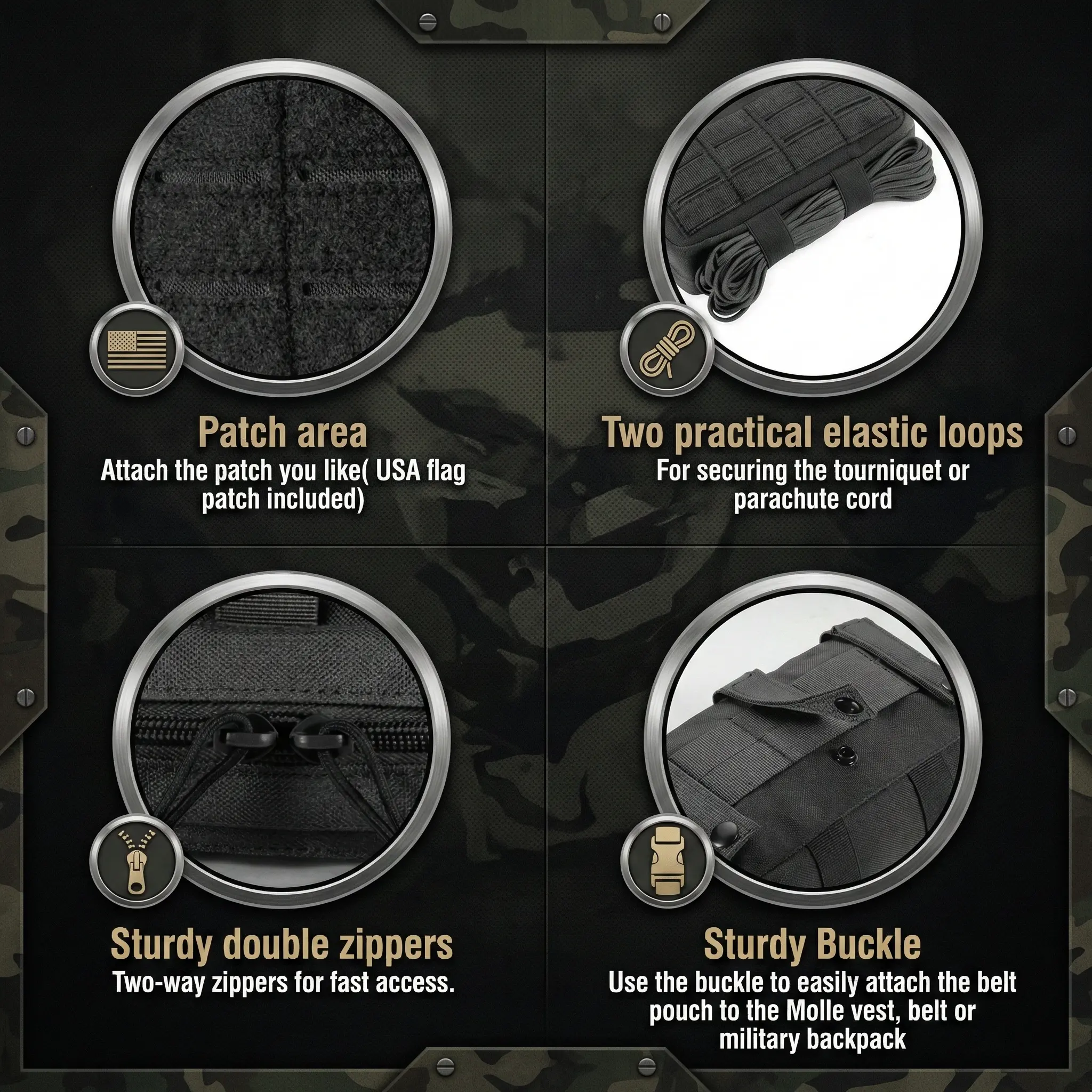 The pouch is lightweight and portable, suitable for biking, cars, or service dogs. It can be used as a vest pouch, pack pouch, tactical waist belt pouch, or IFAK pouch. The patch area allows you to attach a US flag patch. Two practical elastic loops secure the tourniquet or parachute cord.