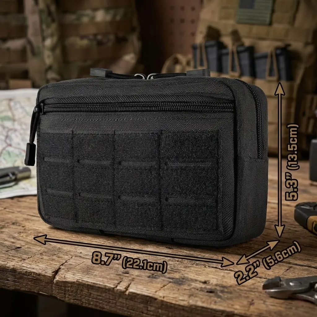 This utility pouch measures 8.7" x 5.3" x 2.2" (22.1cm*13.5cm*5.6cm). It features a 9" by 3" laser-cut Molle/PALS loop panel. Attach extra supplies or Molle gears as needed. The free US flag patch and tactical keychain enhance visibility and functionality. Ideal for EDC use, this pouch keeps essentials organized.