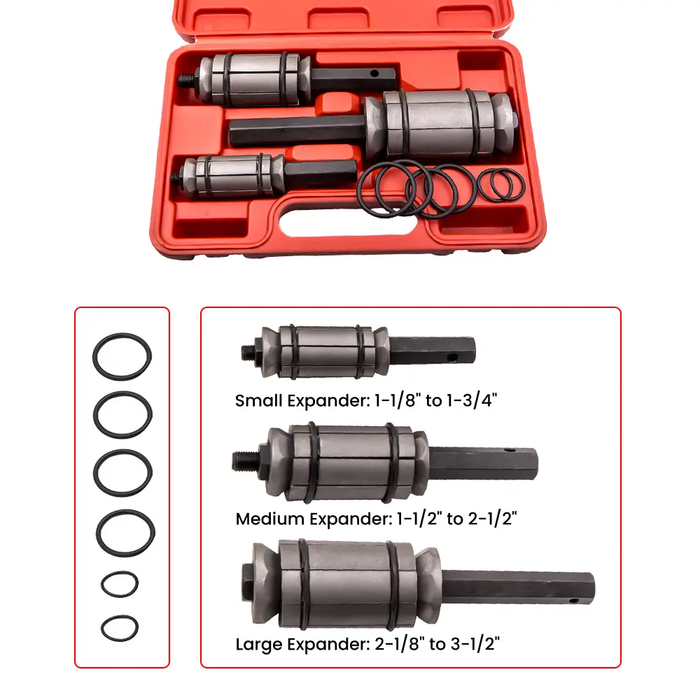 SpecificationSmall Expander: 1-1/8" to 1-3/4"Medium Expander: 1-1/2" to 2-1/2"Large Expander: 2-1/8" to 3-1/2"Type:Exhaust Pipe ExpanderColor: Gray & BlackCondition: Brand Newmaterial:SteelQuantity:3pcsPackage Include: 1x Small Expander: 1-1/8" to 1-3/4"1x Medium Expander: 1-1/2" to 2-1/2"1x Large Expander: 2-1/8" to 3-1/2"6x Extra O-Rings1x Carry BoxAs Picture Showed.Warranty: one year warranty for any manufacturing defectUsing Tips:Insert The Expander In The Damaged Pipe End, and Turn The Expanders Turning Bar Till The Dents Are Dismantled