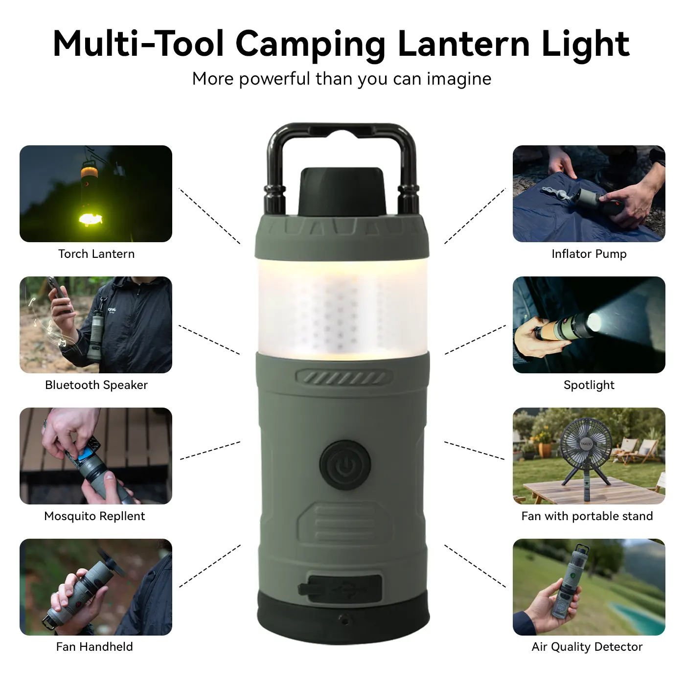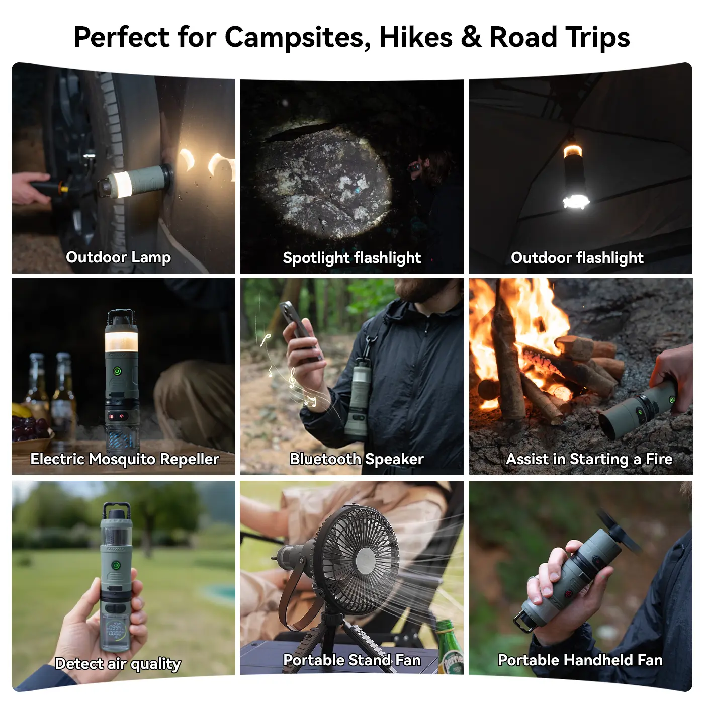 ·Multiple Essential Functions: Use it as a lantern, flashlight, floodlight, spotlight, fan, bluetooth speaker, and air pump — all with magnetic swappable modules.