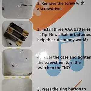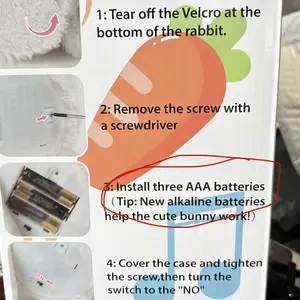 ·Press the black button at the bottom to activate the bunny. Press the left foot to move its ears up and down. Press again to switch the music. The volume control has 3 levels. đ”