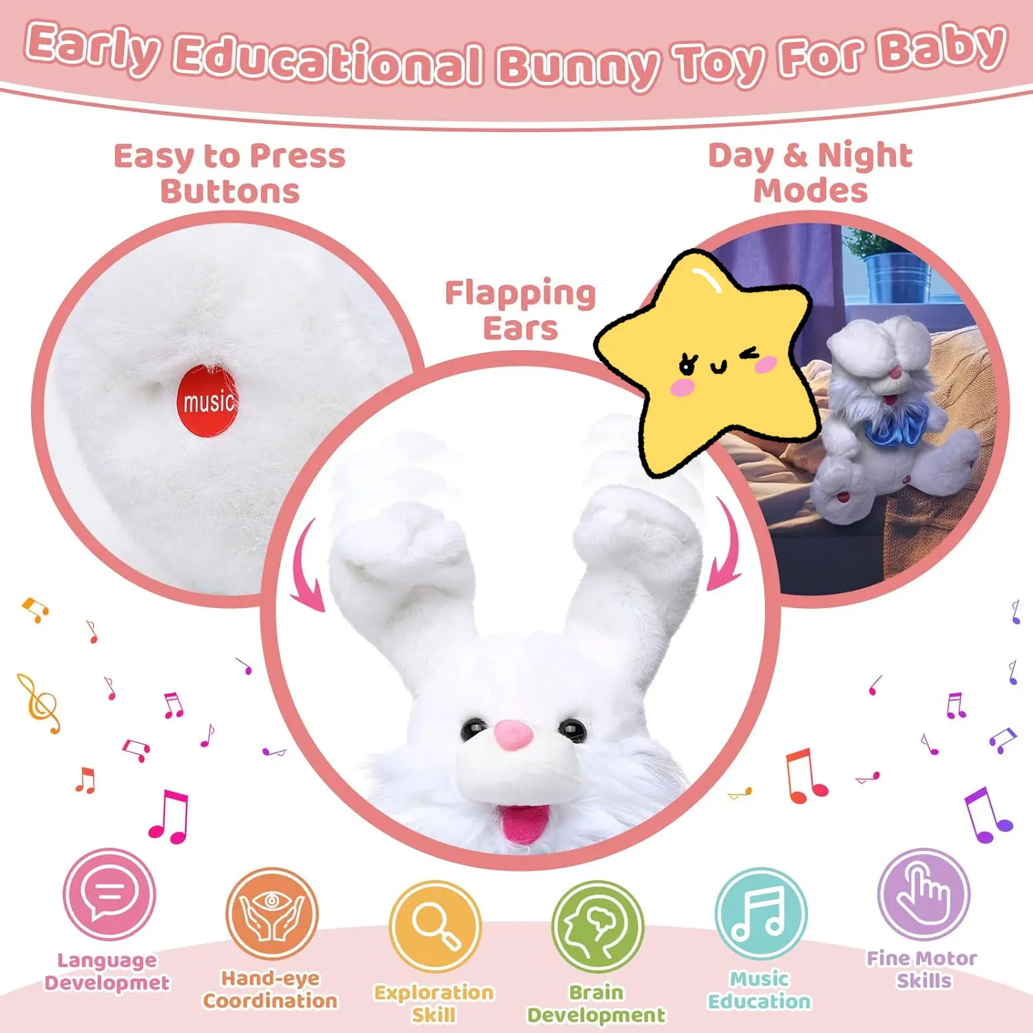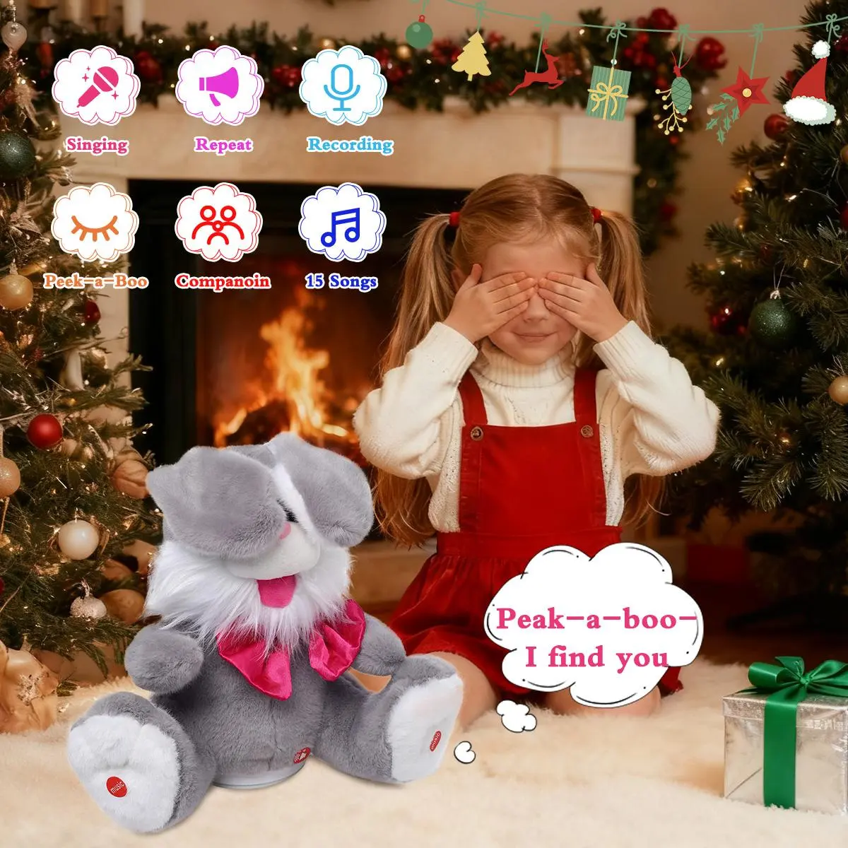 ·Press the buttons on the bunny's feet, and its ears move up. This fun rabbit stuffed animal can repeat, talk, sing, and play peek-a-boo. It's a magical bunny that repeats everything you say, no matter the language or emotion. đ”