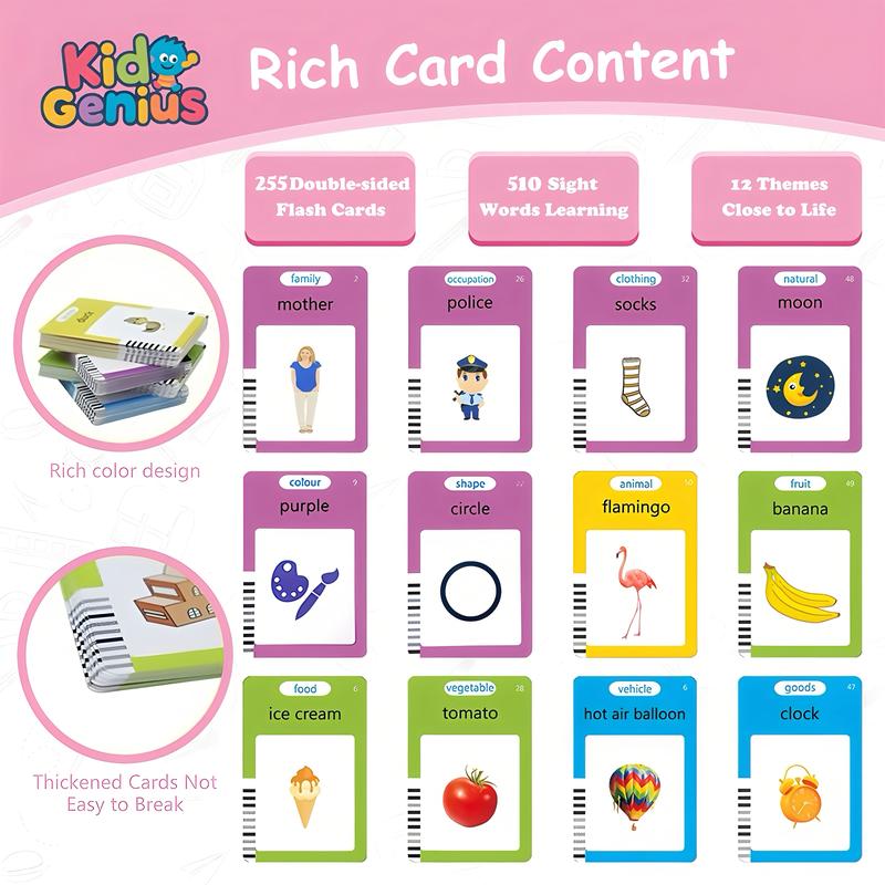 112 double-sided cards cover 510 common vocabulary words, covering animals, numbers, colors, shapes and daily objects, building a diversified knowledge system.