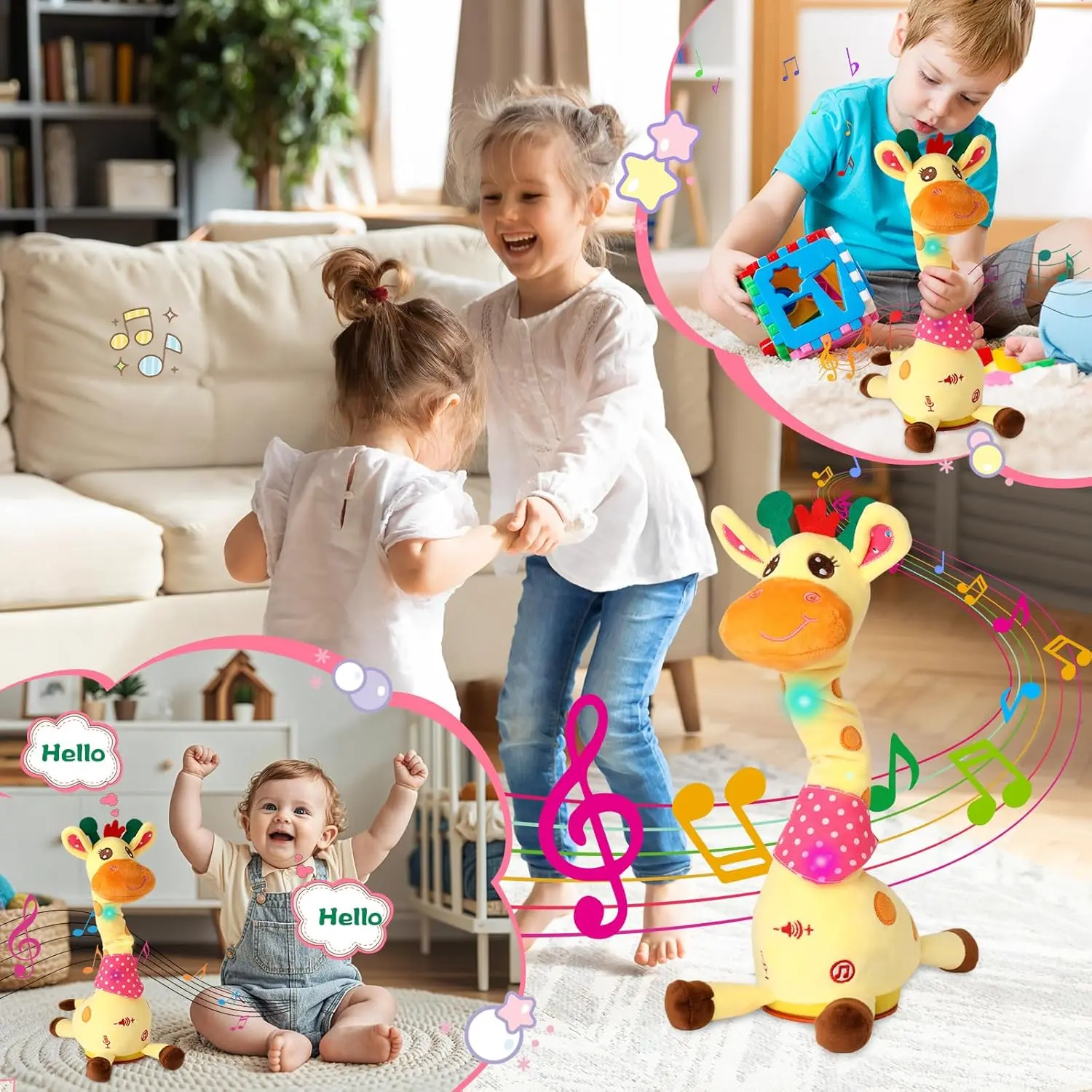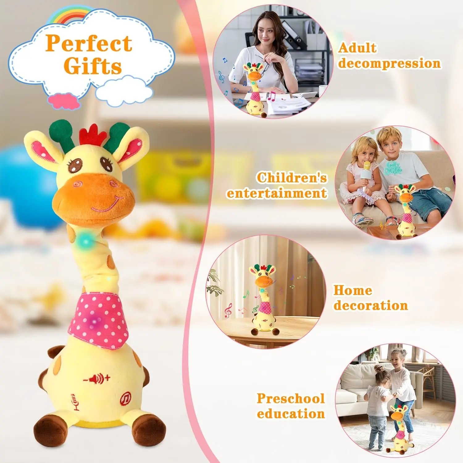 🦒As a four-in-one multi-functional toy, it integrates music playback, light effects, dancing, and recording imitation. A simple press of the switch activates it; the LED lights flash in sync with the music, and the giraffe's neck moves flexibly, allowing children to sing and dance, developing their auditory, visual, and physical coordination skills through entertainment.
